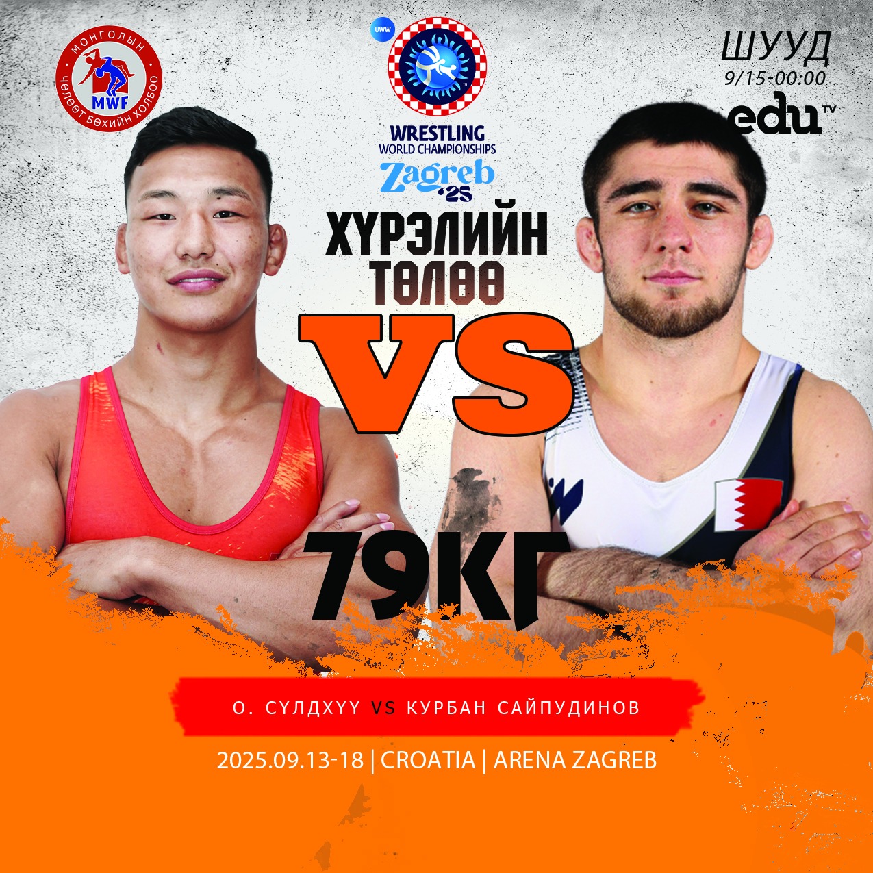 Хорват Улсын Загреб хотноо болж буй чөлөөт бөхийн насанд хүрэгчдийн дэлхийн аварга шалгаруулах тэмцээн үргэлжилж байна. Үдшийн 23:00 цагаас ДАШТ-ий эрэгтэйчүүдийн 79 кг-ын жинд ОУХМ Олонбаярын Сүлдхүү дэлхийн аваргын хүрэл медалийн төлөө барилдана. Түүний өрсөлдөгчөөр Дагестан гаралтай Бахрейны бөх Хидир Сайпудинов тунаж үлдсэн байгаа. Өдгөө 22 настай тэрбээр Азийн аваргын мөнгө, хүрэл медальтай тамирчин юм.