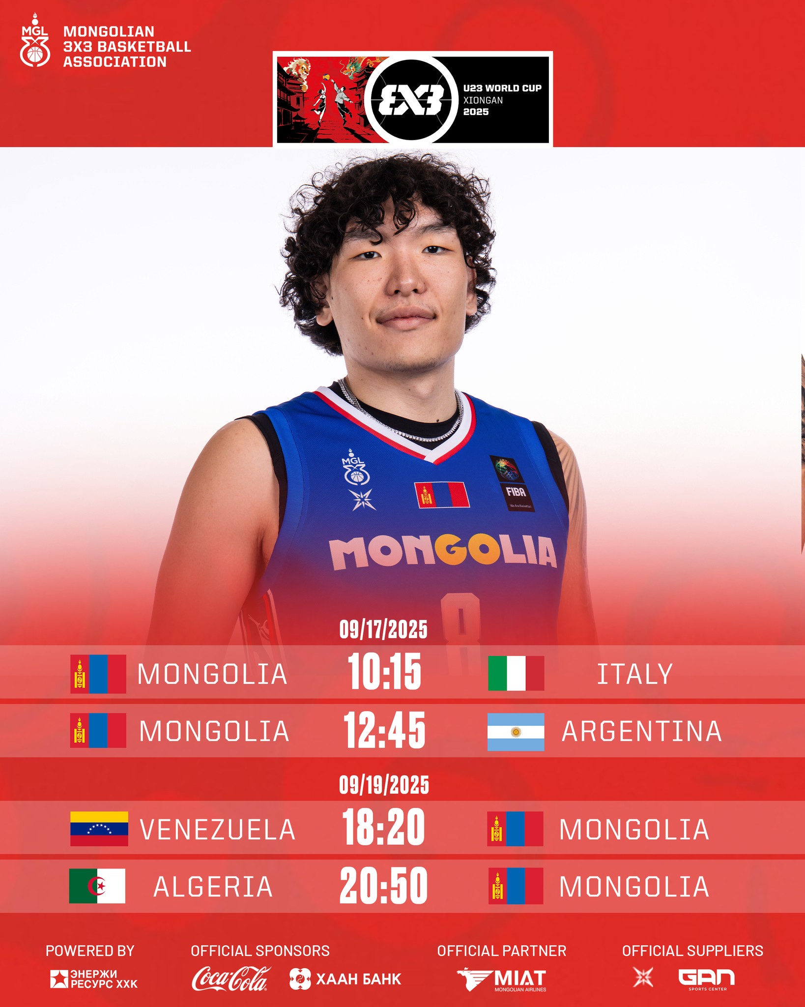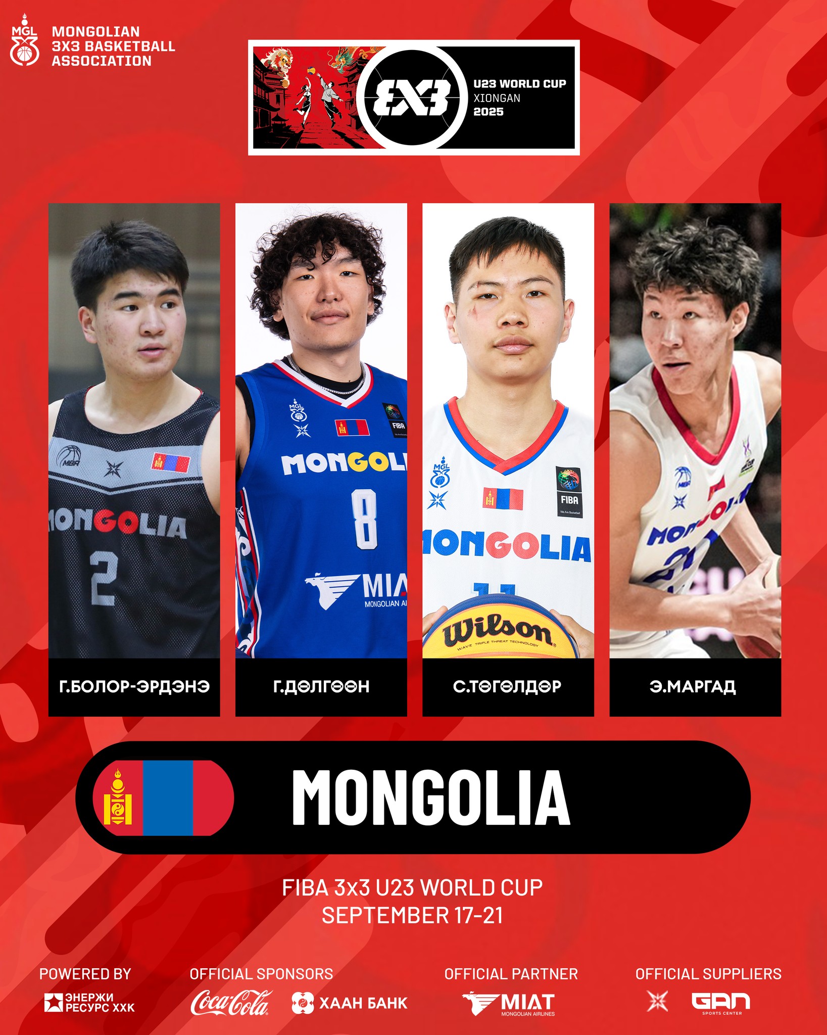 Хятадын Шион Ан хотноо есдүгээр сарын 17-21-ний өдрүүдэд “FIBA 3х3” сагсан бөмбөгийн “U23” ангиллын 23 хүртэлх насны дэлхийн цомын аварга шалгаруулах тэмцээн болно. Тус тэмцээнд эрэгтэй, эмэгтэй тус бүр 20 шилдэг баг өрсөлдөхөөр хуран цуглаад байна. Өнгөрөгч наймдугаар сард зохион байгуулагдсан 23 хүртэлх насны үндэстнүүдийн лигийн тэмцээнд манай эрэгтэй баг нийлбэр дүнгээр түрүүлснээр зургаа дахь удаагийн 23 хүртэлх насны ДАШТ-д оролцох эрхээ авсан юм. Манай багийн бүрэлдэхүүнд Э.Маргад, Г.Дөлгөөн, Г.Болор-Эрдэнэ, С.Төгөлдөр нар багтаж байгаа. Манай баг “С” хэсэгт Итали, Алжир, Аргентин, Венесуэл Улсын багууд багтсан байна.