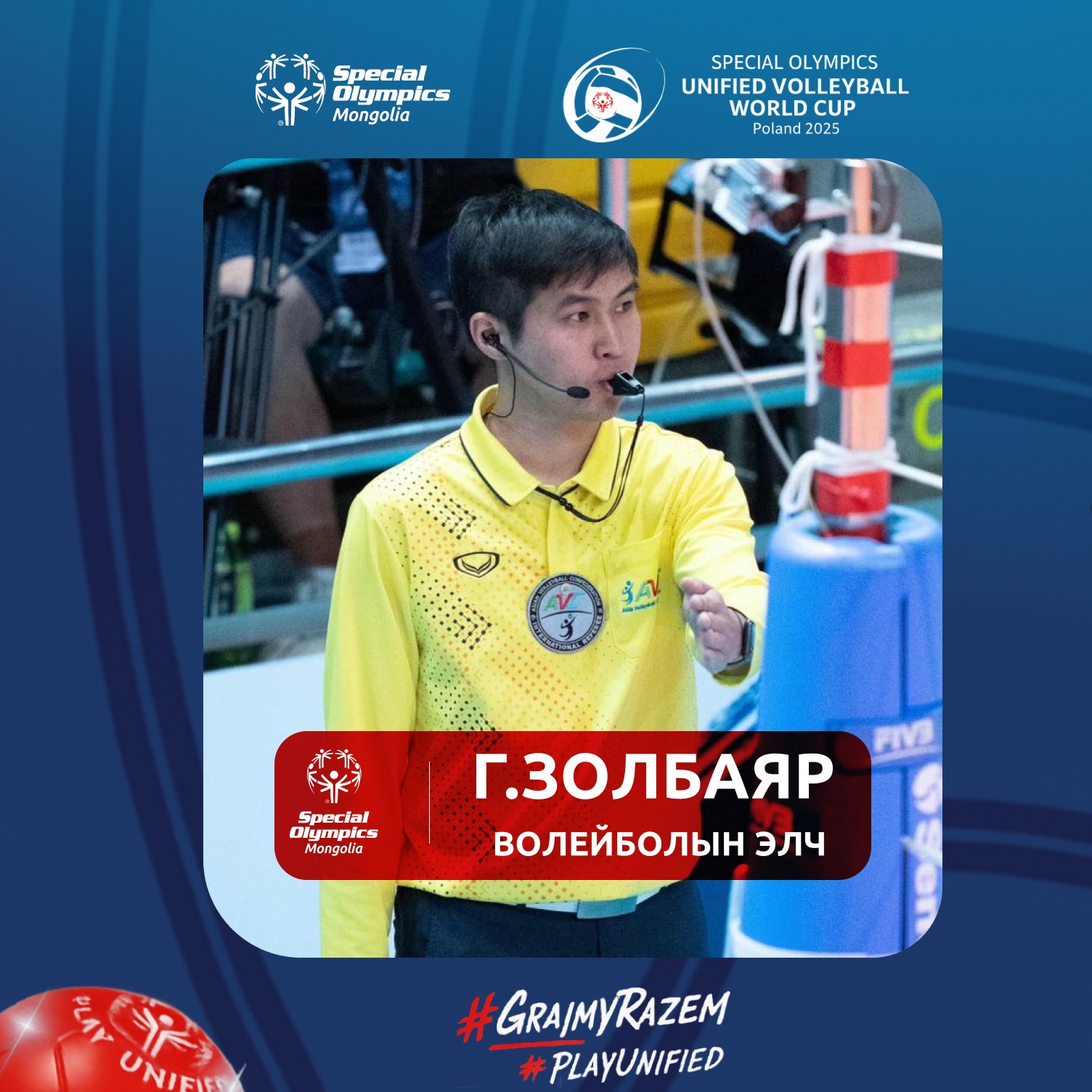 Г.Золбаяр Польш Улсын Катовице хотноо 2025 оны аравдугаар сарын 4-9-ний өдрүүдэд болох тусгай олимпын хамтарсан волейболын дэлхийн цомын тэмцээнд уригдсан байгаа. Монголын тусгай олимпын баг тамирчдыг дэмжин ажиллах юм.