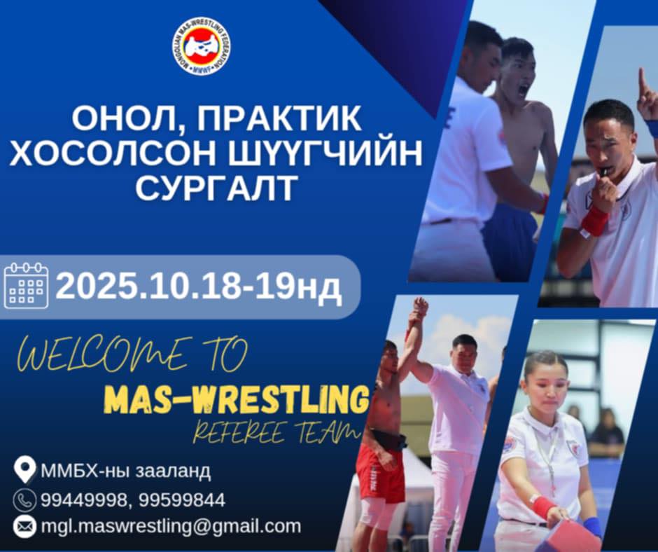 Монголын мас рестлингийн спортын холбооны улсын шүүгч бэлтгэн гаргах онол, практик хосолсон сургалтын тов зарлагдлаа. Тус сургалт нь Монгол Улсад мас-рестлингийн спортоор хичээллэгсэд эрчимтэй нэмэгдэж аймаг,сум, клуб дундах тэмцээн тасралтгүй зохиогдож байгаатай холбогдуулан тус аймаг, сум, байгууллагуудын дүрэм болон практикийн мэдлэгийг дээшлүүлж, аймаг сум бүрт мэргэшсэн модон барилдааны шүүгч бэлтгэх, цаашид өөрийгөө хөгжүүлж тив, дэлхийн хэмжээний наадам, фестивалиудыг шүүн дэнслэх, дэлхийн хэмжээний шүүгчийг бэлтгэхэд гол зорилго оршино.