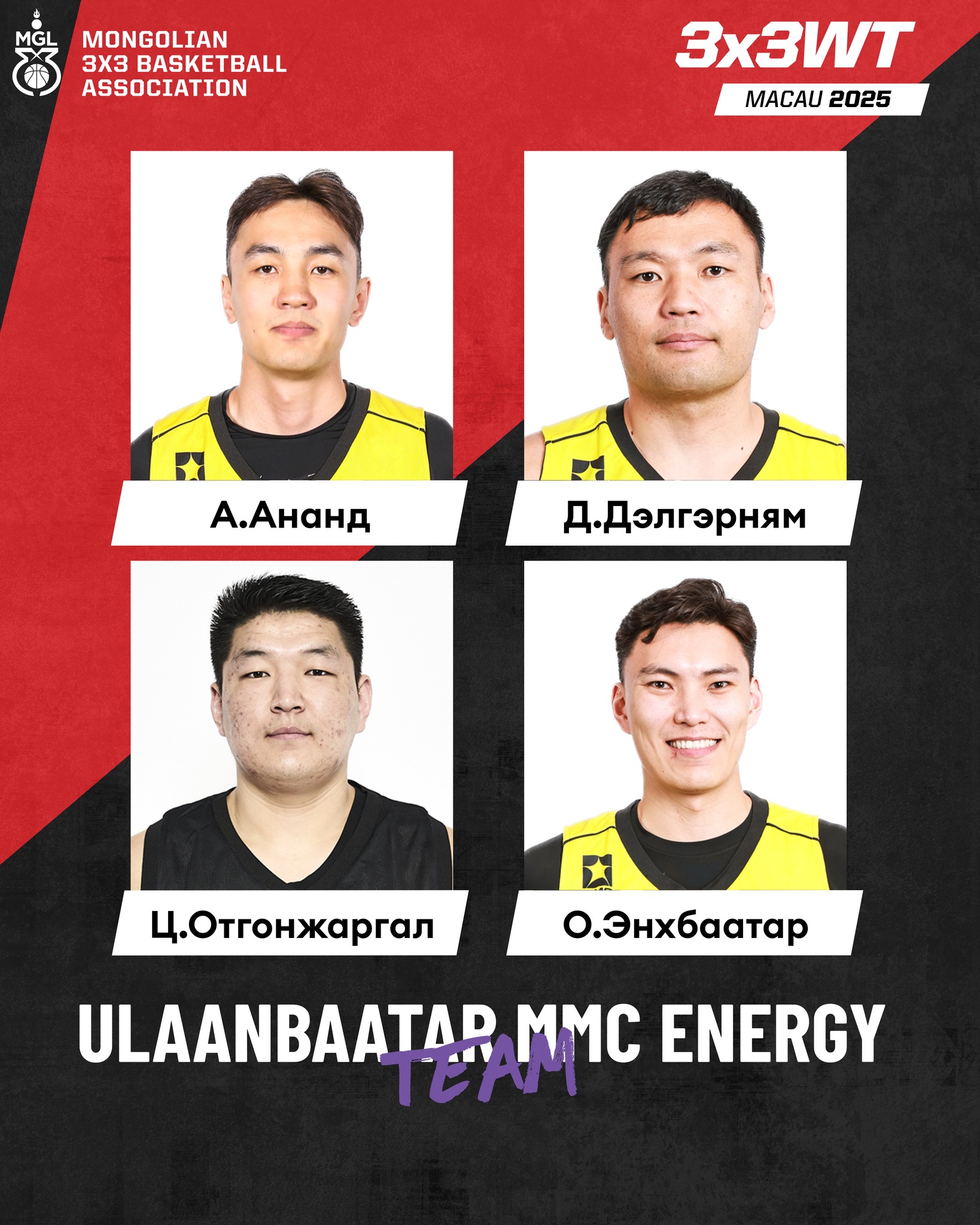 Сагсан бөмбөгийн “FIBA 3x3 Macau World Tour” тэмцээнд аравдугаар сарын 18-ны өдөр болох гэж байна. Тус тэмцээнд “Ulaanbaatar MMC Energy” өрсөлдөнө. Манай улсын багийн бүрэлдэхүүнд А.Ананд, Д.Дэлгэрням, О.Энхбаатар, Ц.Отгонжаргал нар тоглоно. “Ulaanbaatar MMC Energy” баг хэсгийн шатны эхний тоглолтоо 10-р сарын 18-ний өдөр 16:35 цагаас “Liman” багийн эсрэг хийнэ.