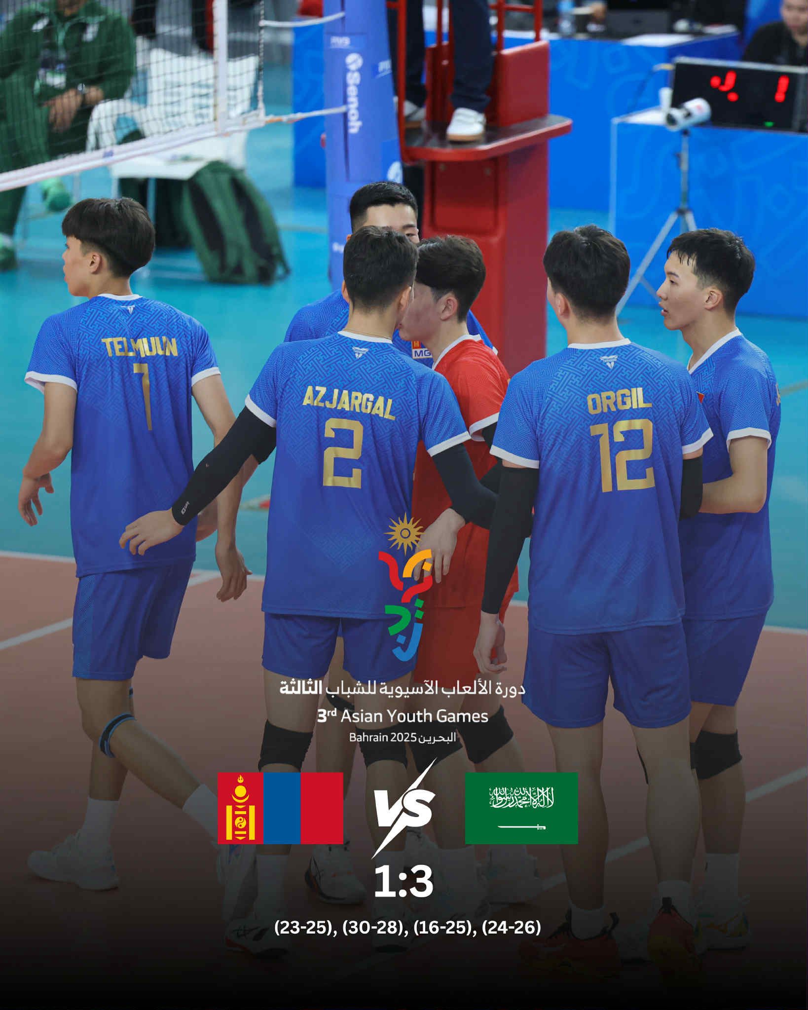 Азийн залуучуудын “Бахрейн-2025” наадмын волейболын шигшээ наймын тоглолт Бахрейн Улсын “Isa Sports City” цогцолборт өчигдөр боллоо. Монголын шигшээ багийн тамирчид Саудын Арабын багтай өрсөлдөж нэгдүгээр үед 23:25 хожигдож, хоёрдугаар үед 30:28-аар хожсон. Гуравдугаар үеийн тоглолтод 15:25-аар, дөрөвдүгээр үед 24:26-аар, дөрвөн сетийн тоглолтод 3:1-ээр хожигдов.