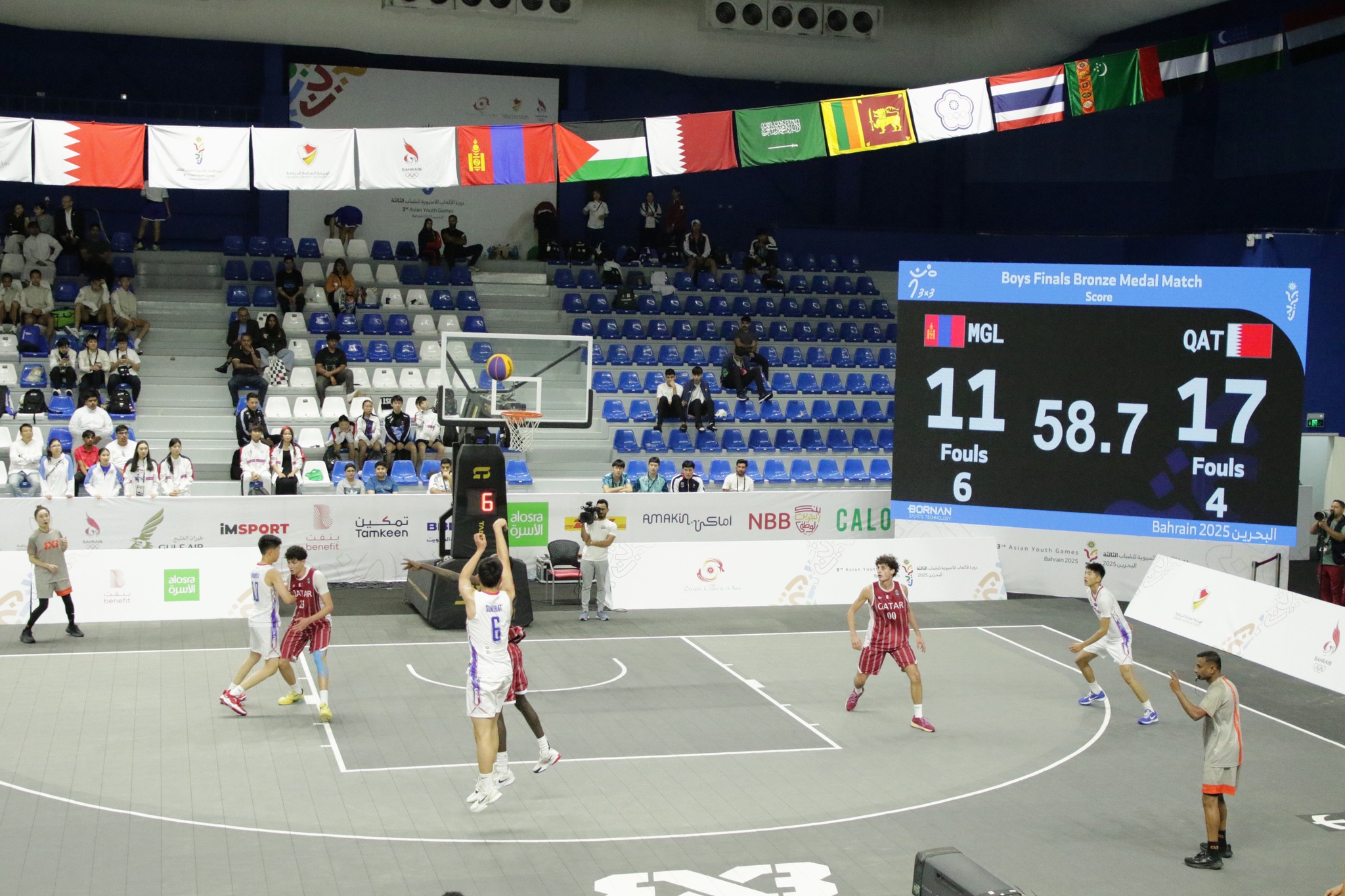 Азийн залуучуудын III наадмын 3х3 сагсан бөмбөгийн төрөлд 21 улс орны шигшээ багууд оролцож, Монгол Улсын шигшээ баг хэсгээсээ нэгээр шалгарсан билээ. “Umm Alhassam” спортын ордонд болж буй 3х3 сагсан бөмбөгийн тэмцээн өрсөлдөөнтэй болж манай баг хүрэл медалийн төлөө Катар Улсын шигшээ багтай өрсөлдөж 13:18-аар хожигдон IV байрт шалгарлаа.