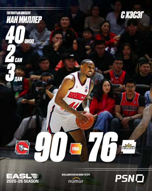 “Хасын Хүлгүүд” баг эх орондоо хийж буй “EASL” лигийн тоглолтдоо Тайванийн лигийн аварга “New Taipei Kings” багийг 14 онооны зөрүүтэй 90:76-аар буулгаж авлаа. Японы лигийн аваргуудыг талбайд нь буулгаж авсан нь тохиолдол байгаагүй гэдгээ Азийн бусад лигийн аваргуудад сануулах шиг боллоо.Тоглолтын эхнээс Miller “класс” түвшний импорт гэдгээ харуулсан бол Азбаяр, Барсболд, Ихбаяр гэсэн “Монголын их гурвал” хэдийн бүрдсэн гэдгийг батлав.
