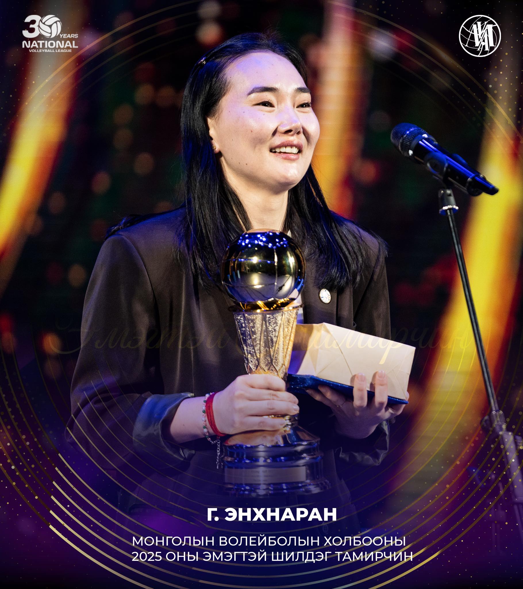 Монголын волейболын холбооны “MVA Rising Ball 2025” шилдгийн шилдгийг шалгаруулах ёслолын арга хэмжээ боллоо. “Khilchin TG” багийн ахлагч, Монгол Улсын шигшээ багийн тамирчин ОУХМ Г.Энхнаран, Монголын волейболын холбооны 2025 оны “Шилдэг Эмэгтэй тамирчин”-аар тодорч “MVA Rising Ball 2025” цомын эзэн боллоо.