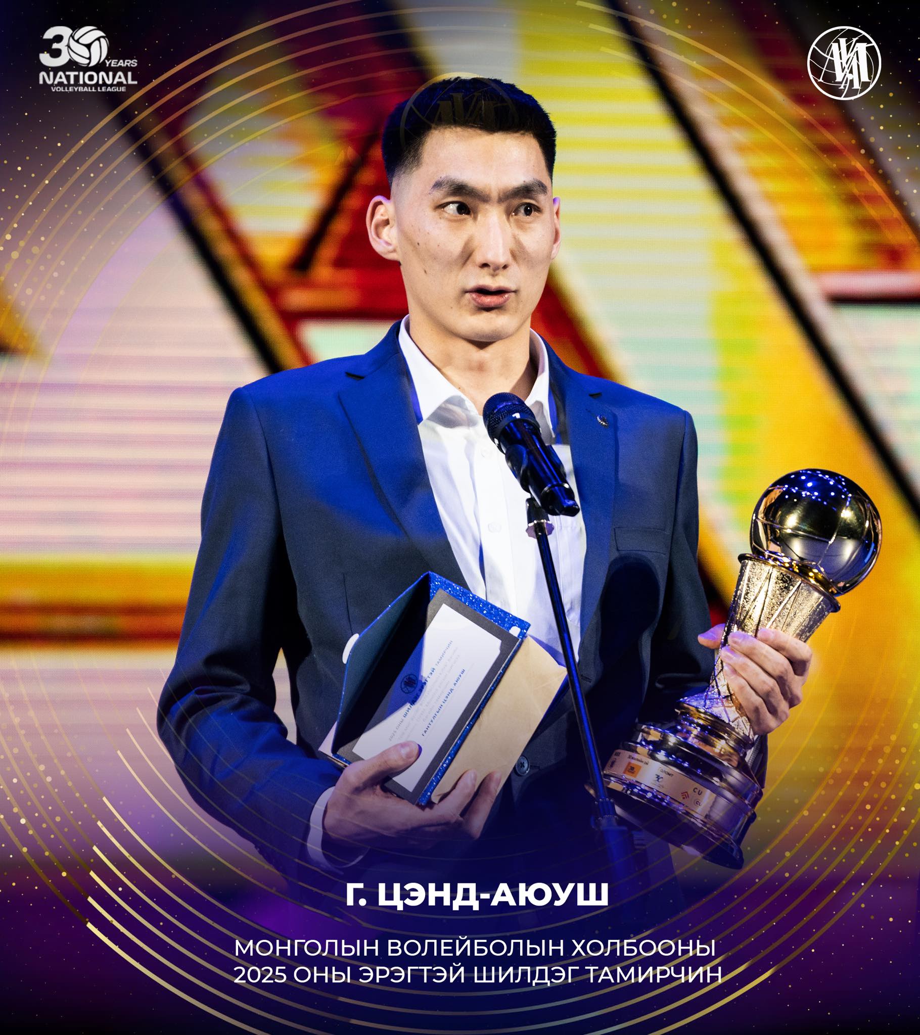 “Tuv Mig Wolves” багийн тоглогч, Монгол Улсын шигшээ багийн тамирчин ОУХМ Г.Цэнд-Аюуш, Монголын волейболын холбооны 2025 оны “Шилдэг эрэгтэй тамирчин”-аар тодорч “MVA Rising Ball 2025” цомын эзэн болов.