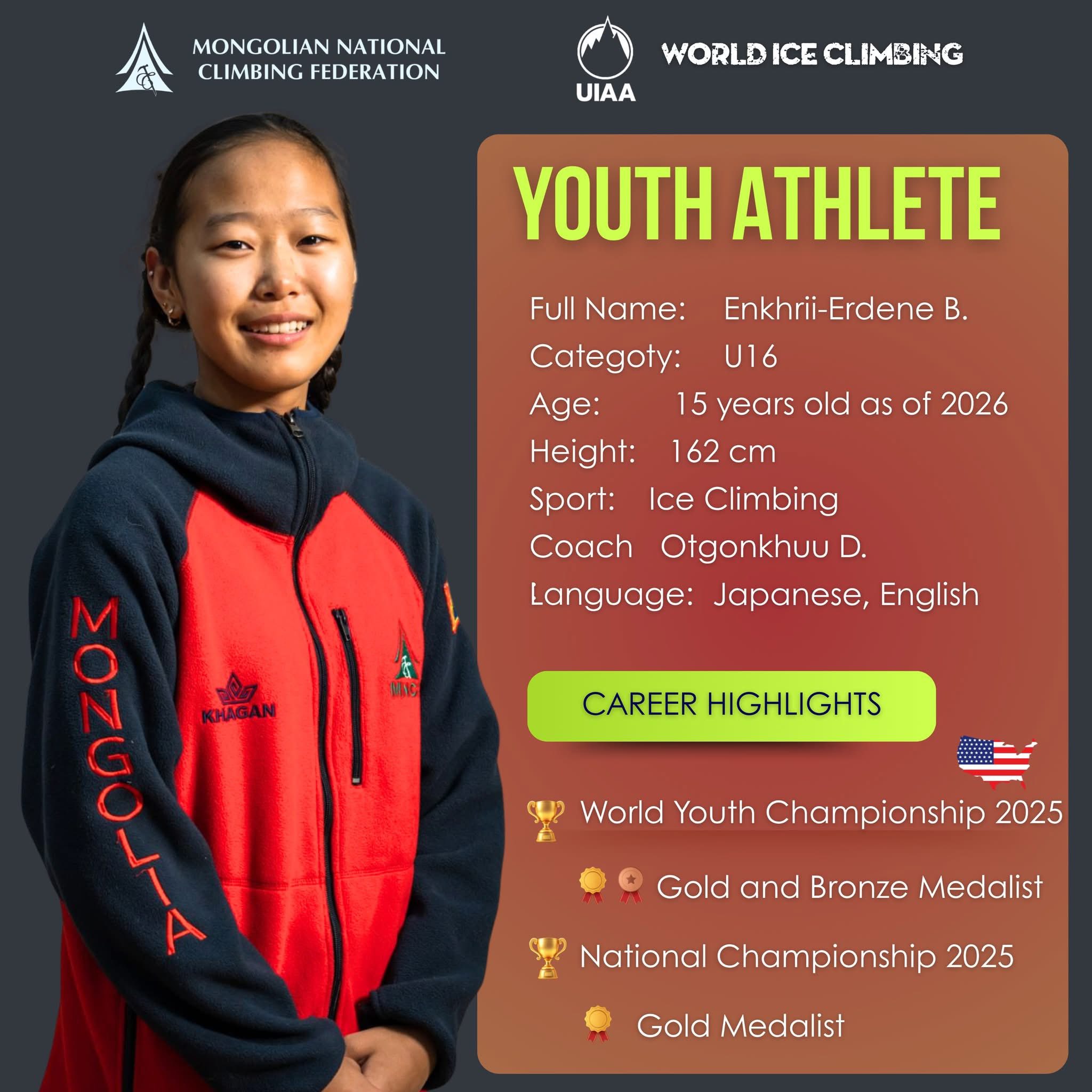 Харин “UIAA” мөсөнд авиралтын залуучуудын ДАШТ-ний “U18” насны ангиллын хурдны төрөлд өрсөлдсөн П.Мөнхбаяр хүрэл медаль, мөн “UIAA” мөсөнд авиралтын залуучуудын ДАШТ-ний “U16” насны ангиллын хурдны төрөлд өрсөлдсөн Б.Энхрий-Эрдэнэ хүрэл медаль хүртсэн амжилт гаргалаа.