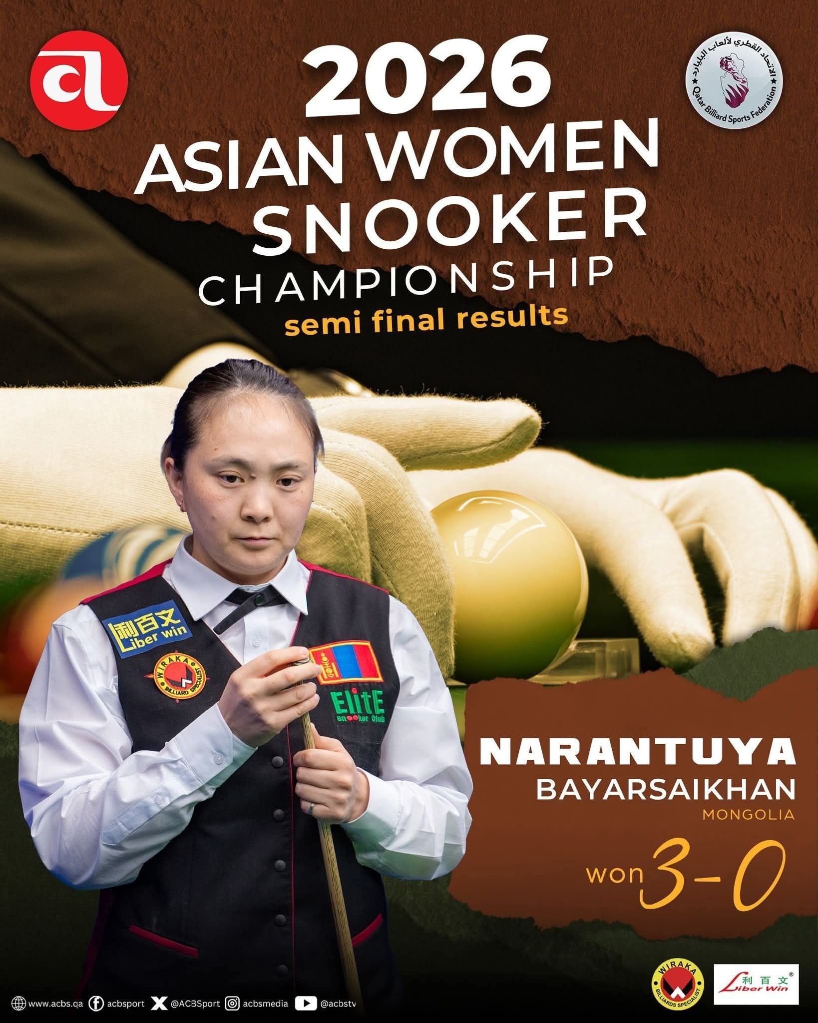 | Б.Нарантуяа снукер биллиардын Ази тивийн хошой аварга боллоо |