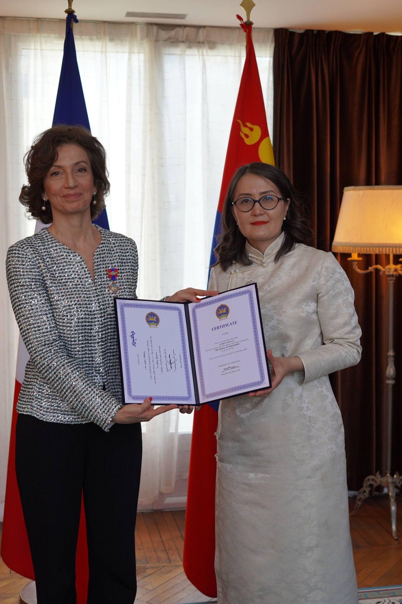Монгол Улсын улс төр, эдийн засаг, нийгэм, хүмүүнлэг, байгаль хамгаалах, олон талт хамтын ажиллагааны салбарыг дэмжиж, Монгол–Францын харилцаа, хамтын ажиллагааг бэхжүүлэхэд оруулсан үнэтэй хувь нэмрийг өндрөөр үнэлэн "Найрамдал" медалиар “ЮНЕСКО”-гийн ерөнхий захирал асан Одри Азулей, Францын "Тахь" ТББ-ын ажилтан Камий Фавиэр, Себастиан Картон де Граммон, Флориан Друар нарыг шагнасныг гардууллаа.