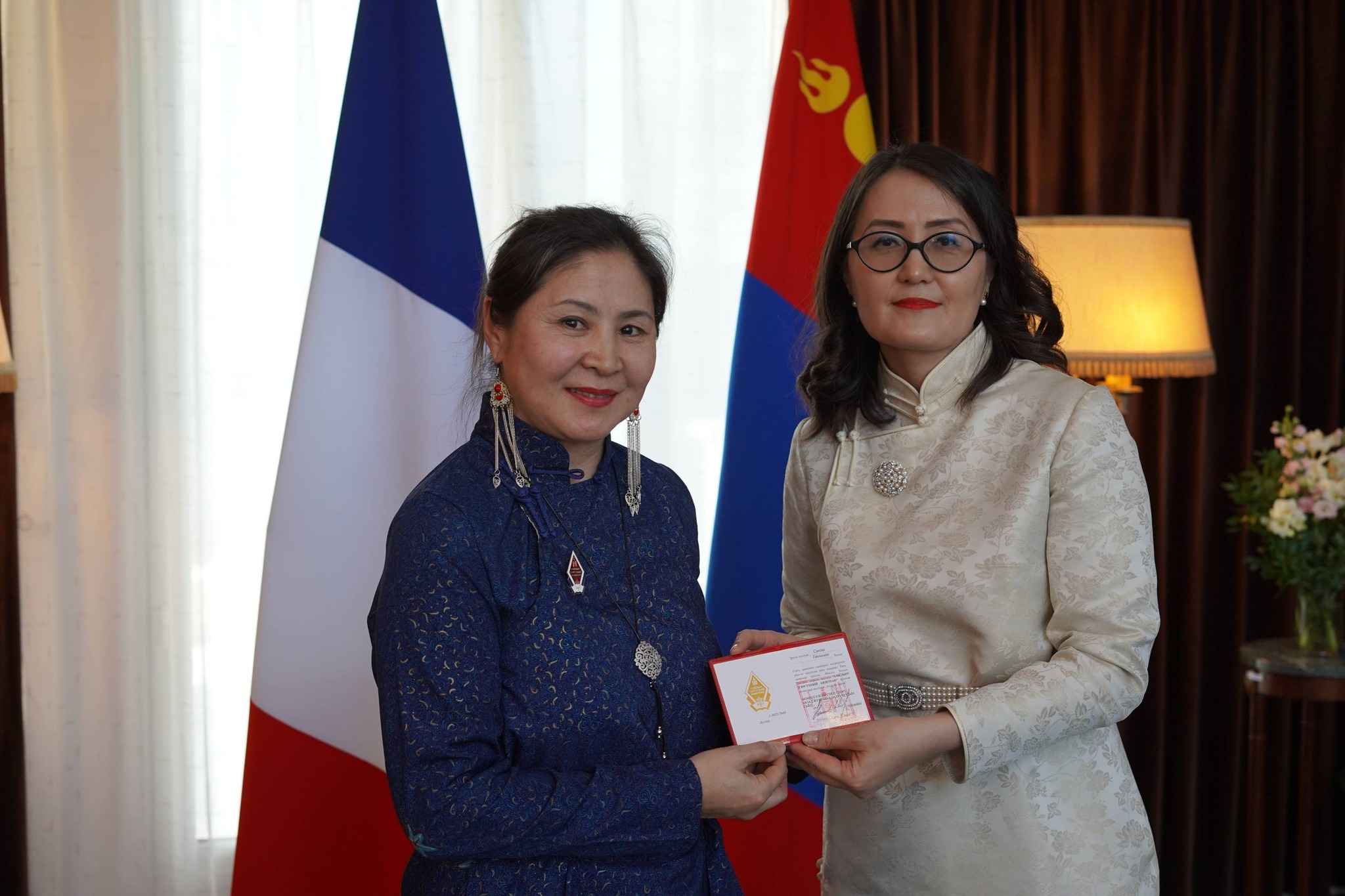 Шагналыг Монгол Улсаас Бүгд Найрамдах Франц Улсад суугаа Онц бөгөөд Бүрэн эрхт Элчин сайд, “ЮНЕСКО”-гийн дэргэд суугаа Байнгын төлөөлөгч У.Нямхүү гардуулав. Шагнал гардуулах үеэр Элчин сайд дипломат харилцааны 60 жилийн түүхэн ойг өнгөрсөн онд тэмдэглэн өнгөрүүлснийг онцлоод Монгол-Францын найрамдалт харилцаа, олон талт хамтын ажиллагааг бэхжүүлэхэд үнэтэй хувь нэмэр оруулсан эрхэм хүмүүст Монгол Улсын Ерөнхийлөгчийн нэрийн өмнөөс халуун баяр хүргэв.
