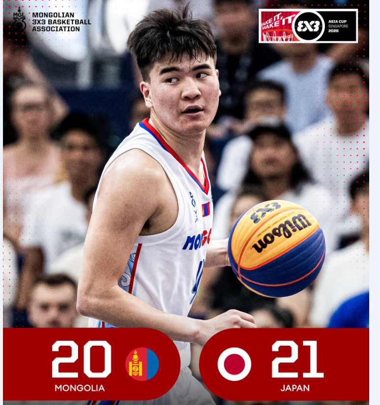 Сагсан бөмбөгийн “FIBA” 3x3-ын Ази тивийн аварга шалгаруулах тэмцээн үргэлжилж байна. Монгол Улсын эрэгтэй шигшээ баг тэмцээний шөвгийн наймын тоглолтоо Япон Улсын шигшээ багийн эсрэг хийж 20:21-ийн харьцаагаар хожигдож Ази тивийн аварга шалгаруулах тэмцээнээ өндөрлүүллээ.