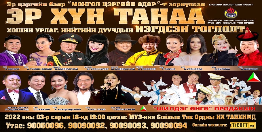 МҮЭ-ийн Соёлын Төв Ордонд эр цэргийн баяр Монгол цэргийн өдөрт зориулан "ЭР ХҮН ТАНАА" хошин урлаг,дуучдын нэгдсэн тоглолт гуравдугаар сарын 18-нд 19:00 цагаас тоглогдох гэж байна.