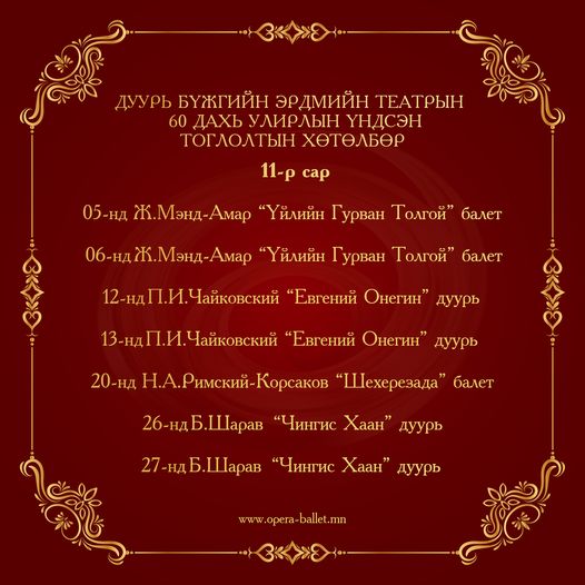 | ТАНИЛЦ: Дуурь бүжгийн эрдмийн театрын ирэх сарын тоглолтын хуваарь |