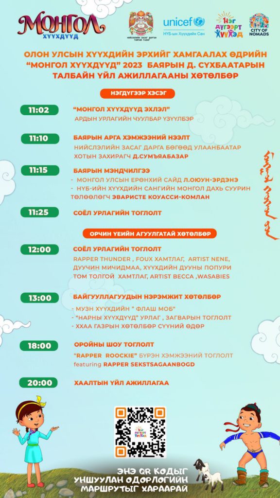 Олон улсын хүүхдийн эрхийг хамгаалах өдрийн Сүхбаатарын талбайн үйл ажиллагааны хөтөлбөр гарчээ. Тус үйл ажиллагаа ардын урлагийн чуулбар үзүүлбэрээр эхэлж, реппер Rookсie-гийн тоглолтоор өндөрлөх байна. Мөн тус баярын үйл ажиллагааны үеэр залуу дуучин, хамтлагууд мөн оролцож ая дуугаа өргөх байна.