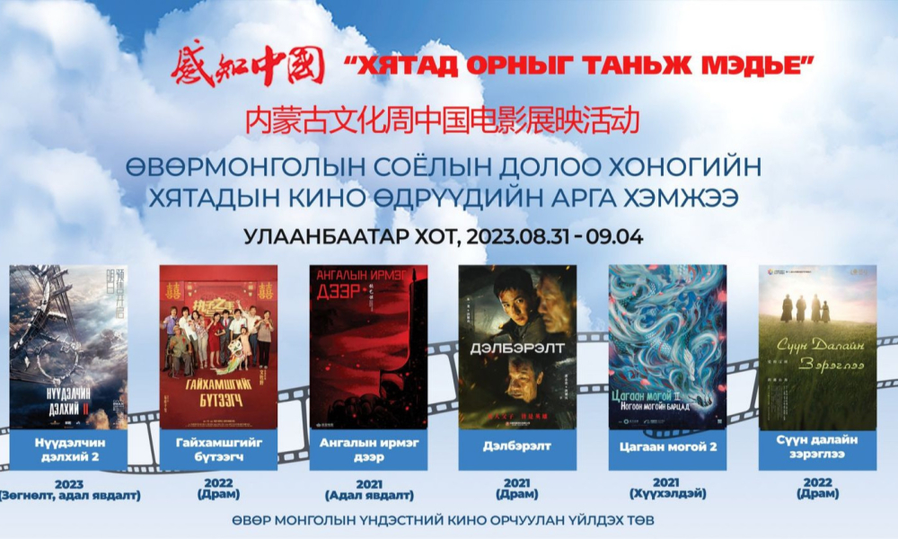 Өвөрмонголын соёлын долоо хоногийн Хятадын кино өдрүүд арга хэмжээ “Хятад орныг таньж мэдье” нэрийн дор эхэлжээ. Тодруулбал, “Хятад орныг таньж мэдье” арга хэмжээний хүрээнд таван киног монгол дуу оруулгатайгаар өнөөдрөөс эхлэн есдүгээр сарын 4-н хүртэл “Тэнгис” кино театрт үнэ төлбөргүй үзүүлэх юм байна.