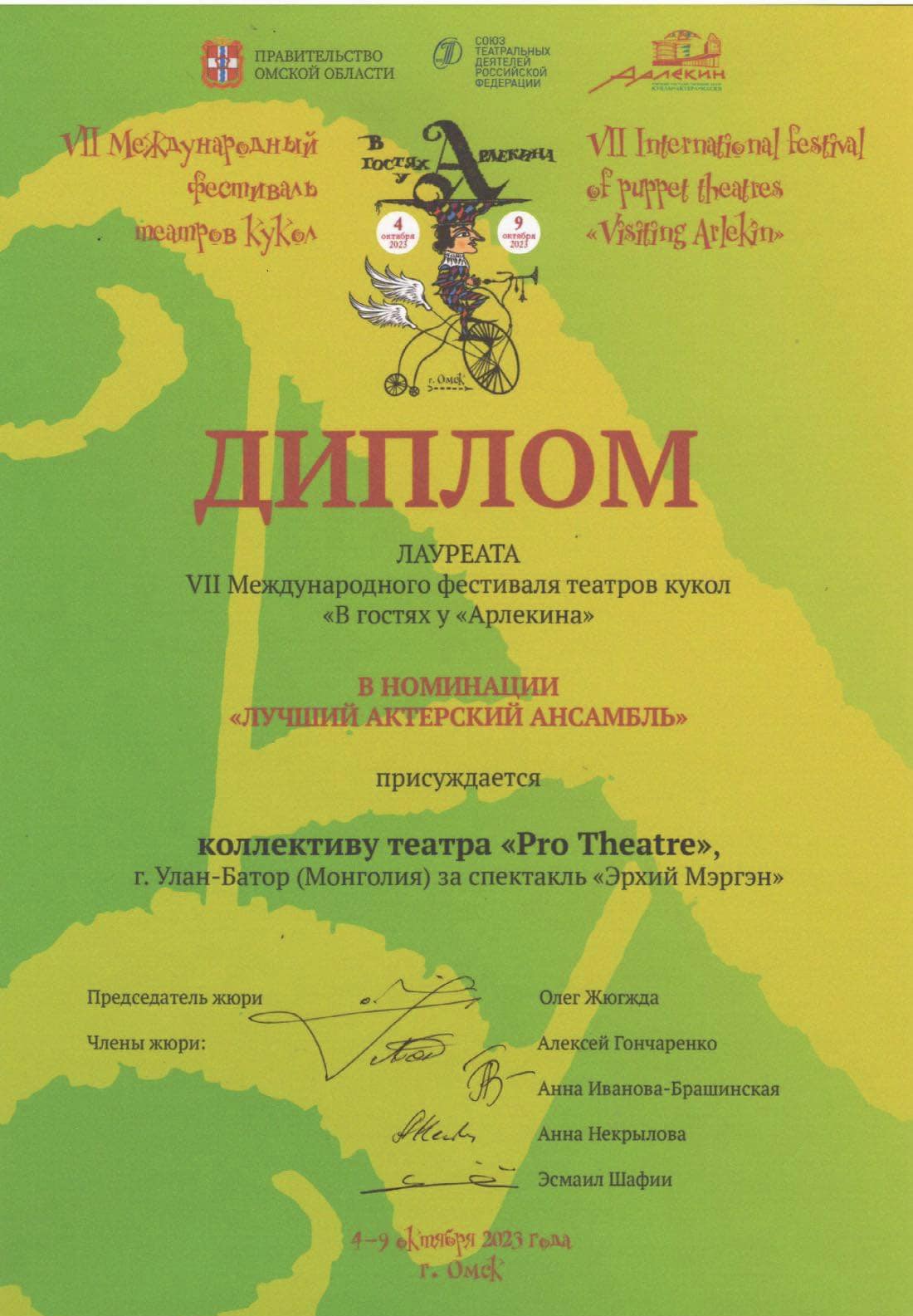 PRO театрын уран бүтээлчид олон улсын наадамд "Эрхий мэргэн" жүжгээрээ шалгарчээ. Тодруулбал, Орос Улсын Омск хотын “Арлекин” театрын “В гостях у Арлекина” фестивальд "Эрхий мэргэн" жүжгээрээ амжилттай оролцож, шилдэг жүжиглэлт төрөлд шалгарчээ. Тус театрын уран бүтээлчид Орос Улсад хоёр ч наадамд оролцсон амжилттай байгаа аж. "Инээмтгий хүн" жүжгийг үзэгчдэд амжилттай хүргэсэн тэд тун удахгүй дараагийн уран бүтээлээ зарлах байна.