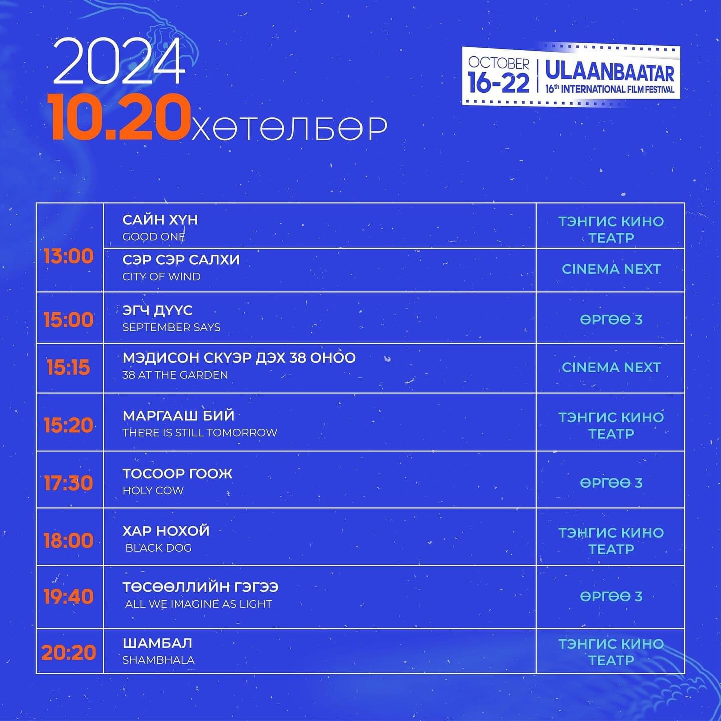 16 дахь удаагийн “Улаанбаатар” олон улсын кино наадам 2024 оны аравдугаар сарын 16-22-ны өдрүүдэд болж буй. Энэ хүрээнд нээлтийн үзвэр, Монгол кино үзвэр, Олон улсын баримтат ба уран сайхны үзвэр, “Үзэхийн Хязгаар” Монголын сонгодог бүтээл, “Залуу үзэгч” хөтөлбөр болон кино уран бүтээлчдэд зориулсан мастер хичээлүүд болж байгаа юм.