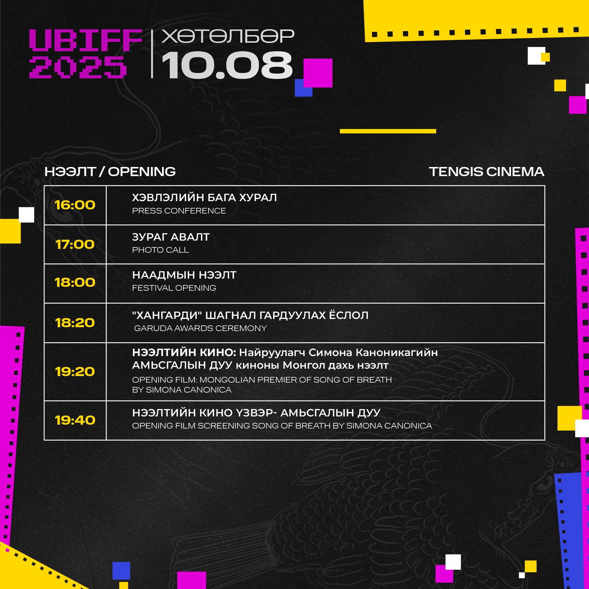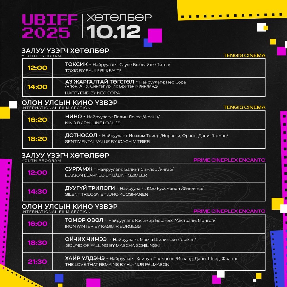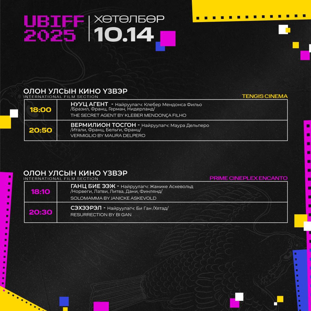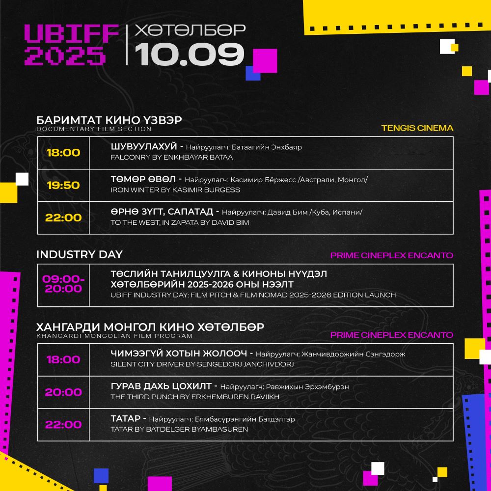 Улаанбаатар олон улсын кино наадмын хөтөлбөр гарчээ. Энэ жилийн наадмын хөтөлбөрт Монгол, Иран, Франц, Герман, Бразил, Норвеги, Хятад, Исланд, Литва, Финланд, Итали, Австрали, Швейцар, Куба, Унгар, Япон зэрэг улсуудын 2024-2025 онд бүтээгдсэн уран сайхны болон баримтат кино үзвэр болох байна. Мөн Монголын сор бүтээлчийн сонгодог бүтээлийг дахин танилцуулах “Үзэхийн хязгаар” хэсэг, “Хангарди” монгол киноны уралдаант хэсэг, “Залуу үзэгч” кино боловсрол олгох хөтөлбөр болон кино уран бүтээлчдийн форумыг Тэнгис кино театр болон Prime Cineplex Encato-д зохион байгуулахаар бэлтгэж байгаа аж.