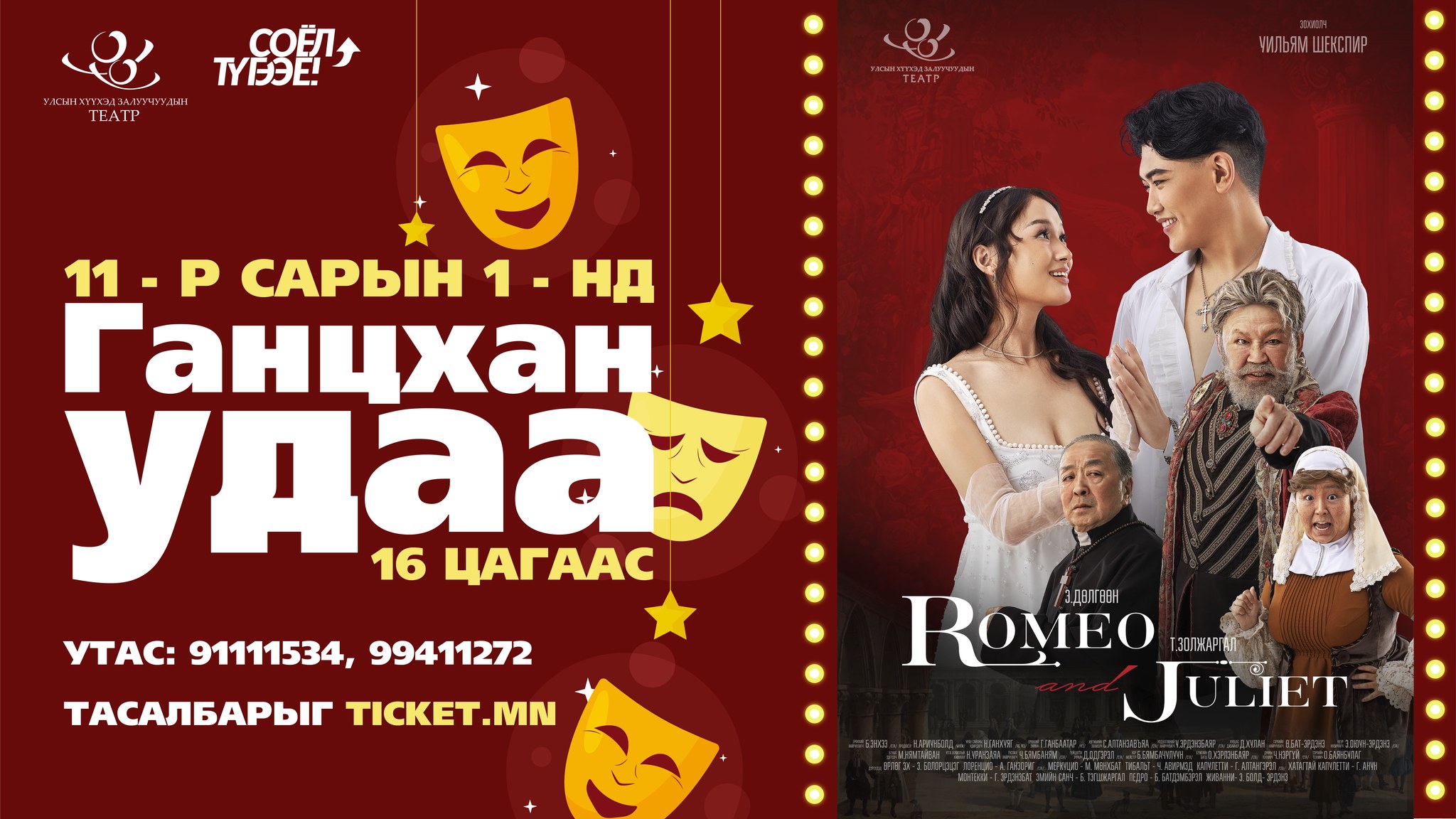 Улсын Хүүхэд, залуучуудын театрын уран бүтээлч У.Шекспирийн "Ромео Жульетта" эмгэнэлт драмын жүжгийг шинэ бүрэлдэхүүнтэйгээр дахин тайзнаа тоглож байгаа билээ. Тэгвэл арваннэгдүгээр сарын 1-нд буюу энэ бямба гарагт 16:00 цагаас дахин тоглохоор болжээ.