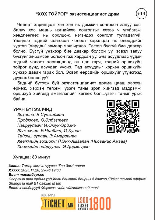 Яруу найрагч, зохиолч О.Элбэгтөгсийн үүсгэн байгуулж буй "Гурван сүүдрийн театр"-ын уран бүтээлчид нээлтийн "Хөх тойрог" жүжгээ Төмөр замын чуулга "Ган зам" паласт энэ сарын 28, 29-нд 19:00 цагаас толилуулахаар товложээ.