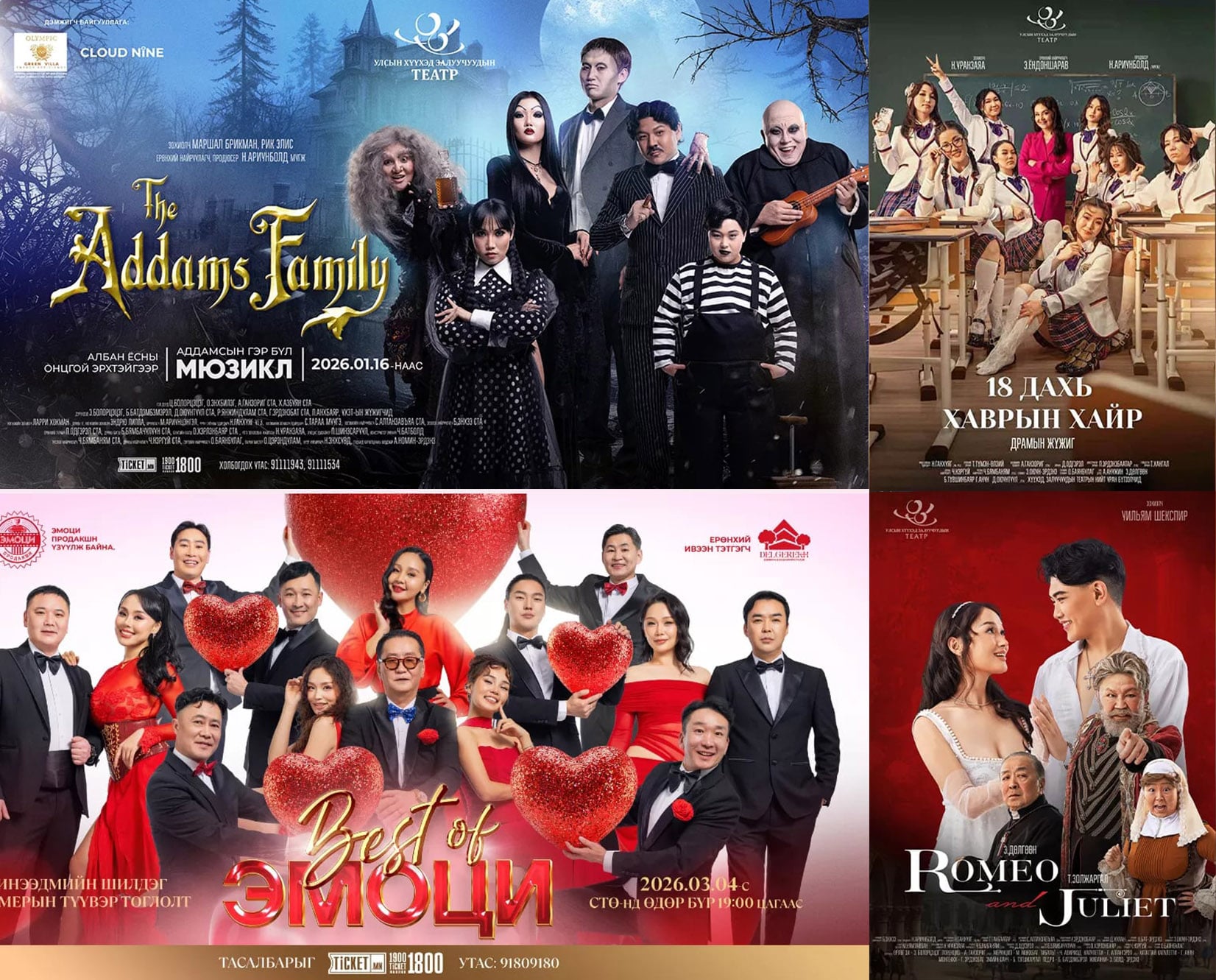 Гуравдугаар сар бол тайзны уран бүтээлчдийн хувьд үзэгчдийг инээд хөөр, уянга мэдрэмжид хөтлөх онцгой уран бүтээлүүдээр дүүрэн сар байдаг. Энэ хугацаанд тайзнаа хошин энтертайнмент шоунаас эхлээд уянгын болон сэтгэлзүйн драм, сонгодог эмгэнэлт жүжиг, хүүхэд багачуудын сонирхлыг татах хүүхэлдэйн болон мюзикл бүтээл гээд олон төрлийн жүжиг бидний сэтгэл зүрх, тархи оюуныг баясгадаг билээ. Энэ ч үүднээс бид тэдгээр үзвэрүүдийн талаарх мэдээллийг уншигч танд хүргэж байна.
