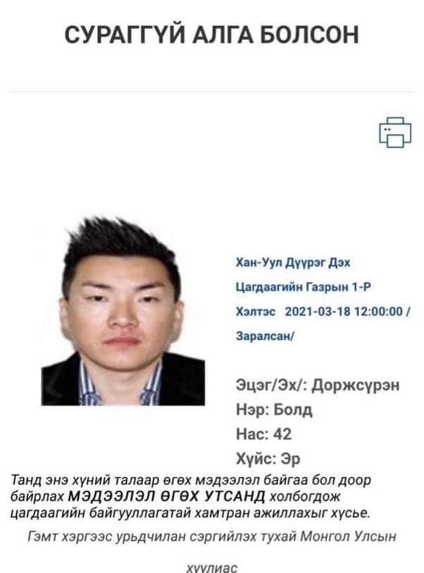 Төрийн соёрхолт дуучин Д.Болдыг цагдаагийн байгууллагаас эрэн сурвалжилж байгаа талаар мэдээлэл гарсан билээ. Тодруулбал, Хан-Уул дүүргийн Цагдаагийн нэгдүгээр хэлтсийн цахим хуудаст түүнийг "Сураггүй алга болсон. Доржсүрэн овогтой Болд 42 настай эрэгтэй. Энэ хүний талаар мэдээлэл байгаа бол мэдээлэл өгөх утсанд хандана уу" гэх агуулгатай мэдээлэл нийтлэгдсэн байсан юм.