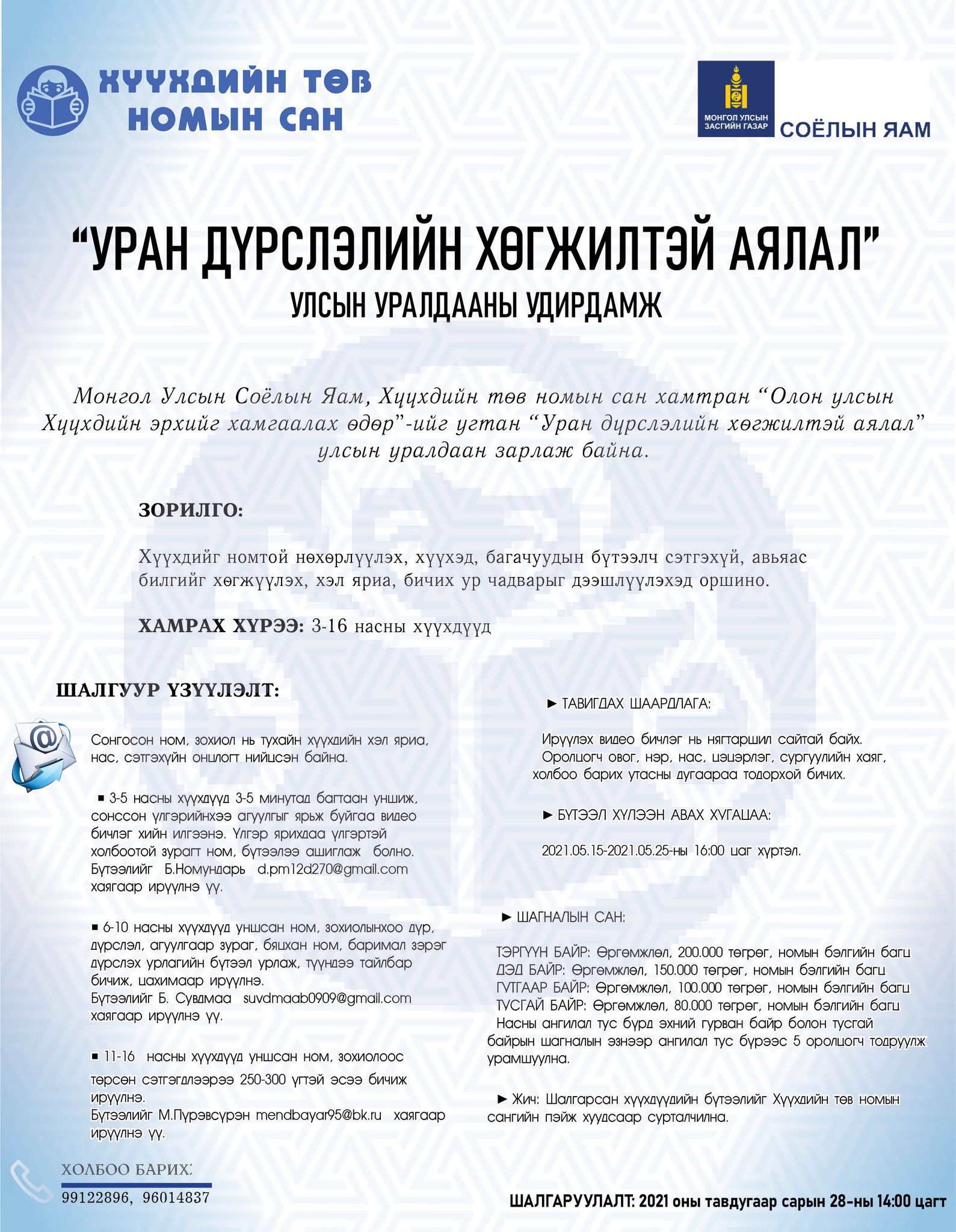 Жич:Шалгарсан хүүхдүүдийн бүтээлийг Хүүхдийн төв номын сангийн пэйж хуудсаар сурталчилна.