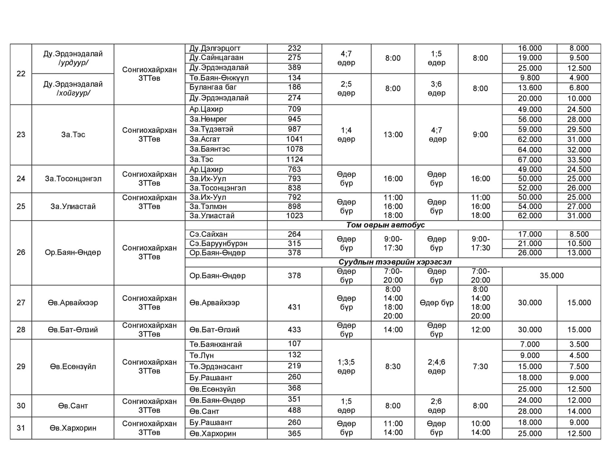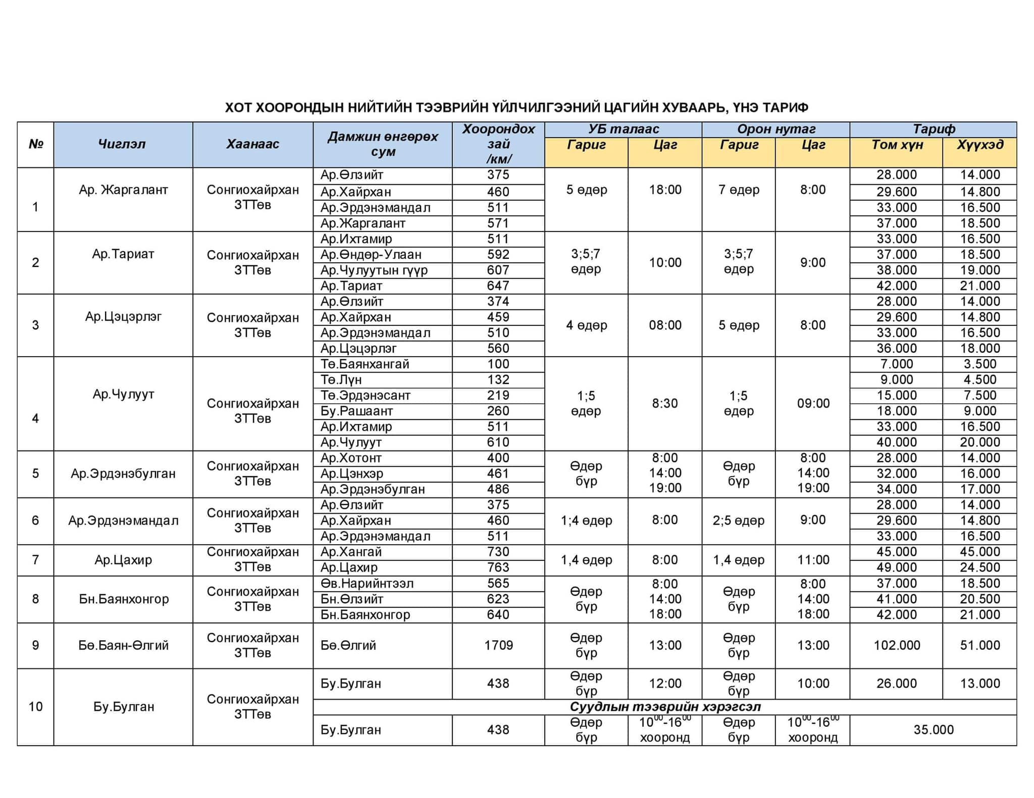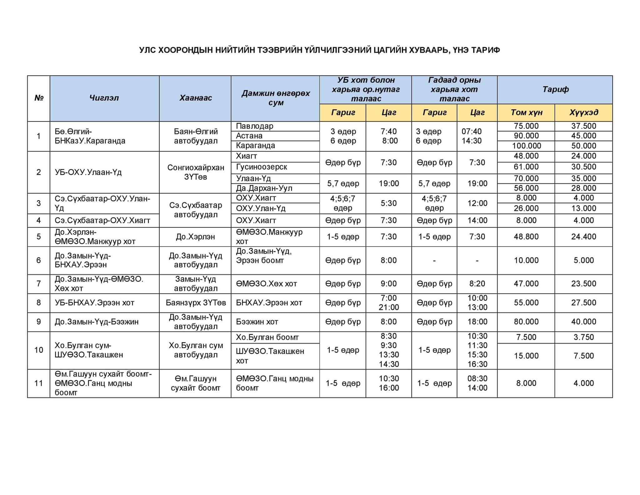 Хот хоорондын нийтийн зорчигч тээврийн хөлс 2013 оны долдугаар сараас хойш нэг километр нь 45-55 төгрөг байсан. Гэвч цар тахлын улмаас зорчигчийн урсгал буурч, шатахууны үнэ нэмэгдсэн тул аж ахуй нэгжүүд хот хоорондын зорчигч тээврийн хөлсөө нэмжээ. Тодруулбал, Зам, тээврийн хөгжлийн сайдын 2019 оны 374 дүгээр тушаалын хоёрдугаар хавсралтаар нэг хүн.километрийн өртгийг 60-75 төгрөг байхаар тогтоосныг баримтлан нэг хүн.километрийн өртгийг 60-65 төгрөг болгожээ.