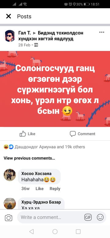 -Байлгүй яах вэ. Хэсэг залуус хоорондоо зодолдоод, цагдаа ирсэн чинь сандраад хоёр машиндаа хуваагдаад суусан гэсэн. Гэтэл хоёр нь машинаа андуураад суучихсан байсан гэсэн. Эргэж уулзаж, хүнээ солилцож байсан түүхийг нэг хүн бичиж байсан нь санаанаас огт гардаггүй. Энэ түүхээр нь “Маск продакшн” нэг жүжгийнхээ сурталчилгааг хийсэн байдаг. Уншигчид санаж байгаа бол жүжигчин Баярмагнай “Би андуурчихсан уу. Та нар андуурсан уу” гэдэг сурталчилгаа байдаг даа. Бас Үндсэн хуулийн цэцийн нэгэн гишүүн Солонгосын онгоцны үйлчлэгч эмэгтэйн өгзөгт гараараа хүрсэн асуудал сөхөгдсөнтэй холбоотой нэг пост бий. “Солонгосчууд ганц өгзөгөн дээр сүржигнээгүй бол хонь, үрэлнээсээ өгөх л байсан юм” гэж нэг хүн бичсэн байсан. Коронавирусийн халдвар дэлхий дахинд тархаж, нийгэмд маш айдастай байх үед ийм хөгжилтэй зүйлсээр дархлаагаа сэргээж байсан нь онцлог санагддаг юм.