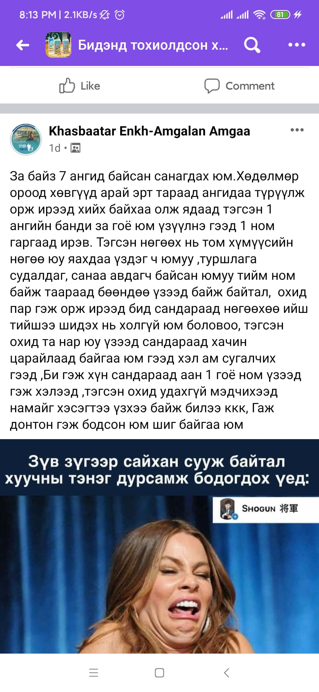 -Танай сайтын уншигчдад энэ өдрийн мэнд хүргэе. Урьд нь "Бидэнд тохиолдсон хөгтэй явдлууд" гэдэг нэртэй групп байдаг байсан юм. Хүмүүс тэр группт хөгтэй явдлаа бичиж байгаа нь анхаарал татаж, нэлээд сонирхож уншдаг байв. Гэтэл тухайн үед жаахан хүнд сэдвээр пост бичихээр зарим хүн их дургүйцдэг, эсэргүүцдэг байсан. Заримдаа бүр хэрүүл маргаан болох тохиолдол ч гардаг байв. Тэгээд би "Яагаад хүндхэн сэдвээр бичдэг, түүнийг нь ойлгодог, бас эрч хүч, инээд, энерги авдаг групп байж болохгүй гэж" гэж бодоод 2013 оны арванхоёрдугаар сарын 13-нд энэ группээ нээж байсан.