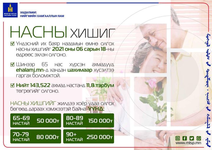 “Насны хишиг” тэтгэмжийг энэ сарын 18-наас олгож эхэлнэ хэмээн ХНХЯ-наас мэдээллээ. Уг тэтгэмжийн хүрээнд: