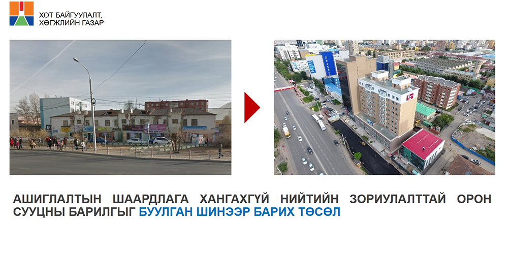 Хот төлөвлөлт, байгуулалтын талаарх судалгааны ажлууд, тэдгээрт тулгуурлан, дэвшүүлж буй шийдлүүдийг цувралаар хүргэхээр Хот байгуулалт, хөгжлийн газар ажиллаж байна. Иргэд “Ашиглалтын шаардлага хангахгүй, нийтийн зориулалттай орон сууцны барилгыг буулган, шинээр барих” төслийн тухай мэдээ мэдээллийг Хот байгуулалт, хөгжлийн газрын бэлтгэдэг i-Up контентоор хүлээн авах боломжтой.