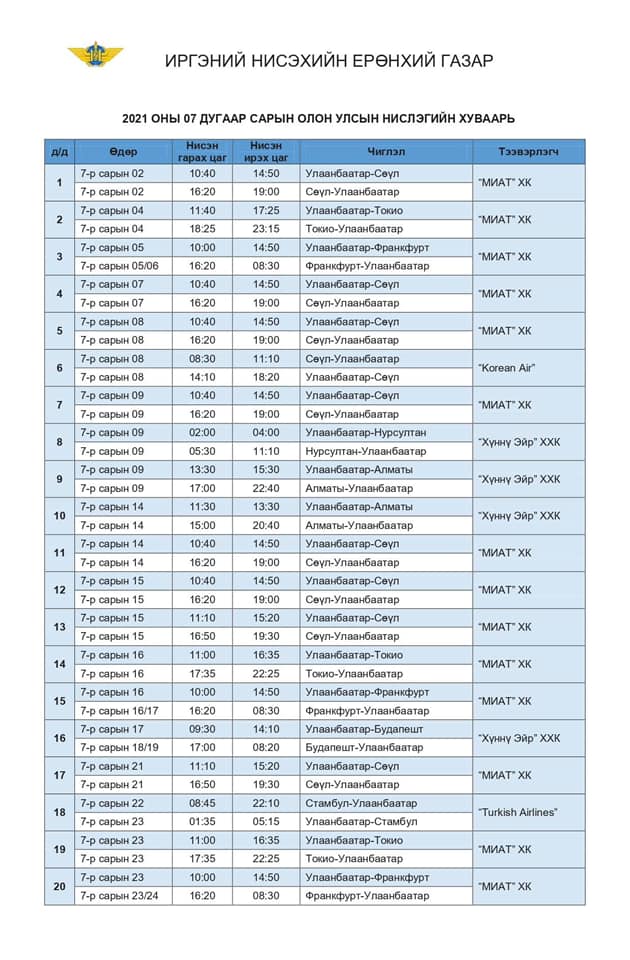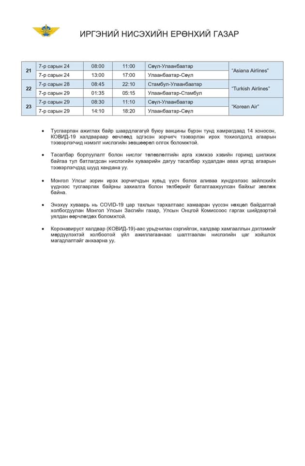 ИНЕГ-аас ирэх сард доорх нислэгүүдийг үйлдэхээр төлөвлөжээ. Мөн вакцины бүрэн тунд хамрагдаад 14 хоносон болон коронавирусээр өвчлөөд эдгэсэн зорчигч тээвэрлэн ирэх тохиолдолд агаарын тээвэрлэгчид нэмэлт нислэг хийх боломжтой аж. Тус газраас “Тасалбар борлуулалт болон нислэг төлөвлөлтийн арга хэмжээ хэвийн горимд шилжиж байгаа тул батлагдсан нислэгийн хуваарийн дагуу тасалбар худалдан авах иргэд агаарын тээвэрлэгчдэд шууд хандана” гэдгийг мэдээллээ.