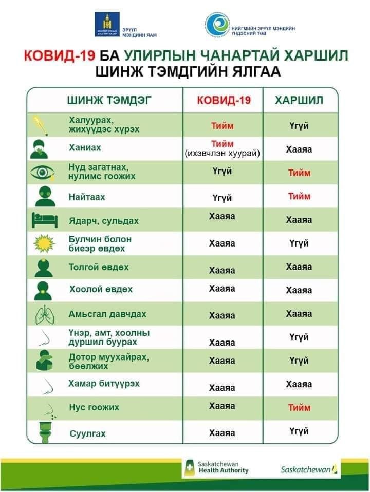 Коронавирусийн халдвар ба улирлын чанартай харшлын шинж тэмдгийн ялгааны талаарх мэдээллийг Эрүүл мэндийн яам болон Нийгмийн эрүүл мэндийн үндэсний төвөөс хүргэж байна.