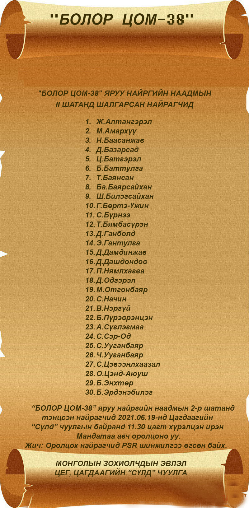 Энэ жил наадмын хоёрдугаар шатанд 30 найрагч шалгарсан бөгөөд найрагчдийн сүүлийн шатны уралдаан 2021 оны зургаадугаар сарын 19-нд болох байсан юм. Гэтэл цар тухлын улмаас өнөөдөр хүртэл хойшилсон аж.