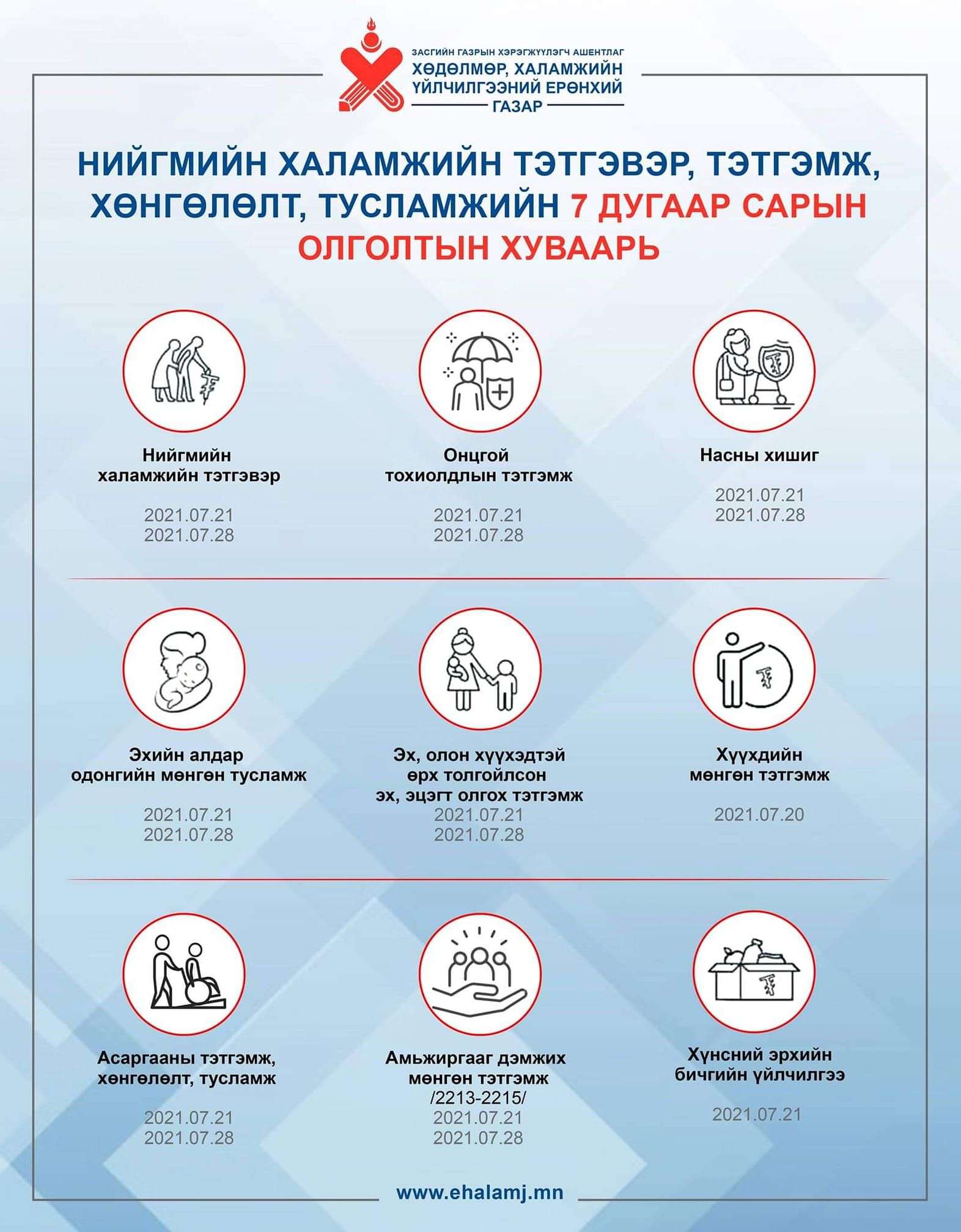 Хөдөлмөр, халамжийн үйлчилгээний ерөнхий газраас 2021 оны долдугаар сарын нийгмийн халамжийн тэтгэвэр, тэтгэмж болон хөнгөлөлт тусламж өгөх хуваарийг танилцууллаа.