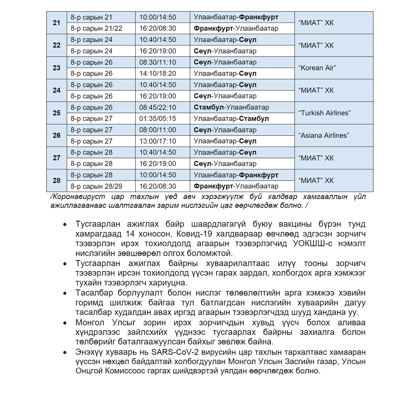 Дэлхийн олон улс оронд SARS-CoV-2 вирусийн дельта хувилбар эрчимтэй тархаж байгаатай холбогдуулан УОК-ын Шуурхай штабаас олон улсын нислэгийн тоог тусгаарлан ажиглах байрны хүрэлцээнд уялдуулан дахин шинэчилж ирүүлсний дагуу 2021 оны наймдугаар сарын нислэгийн цагийн хуваарийг дараах байдлаар дахин шинэчлэн баталлаа.