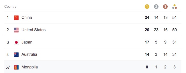 1. Хятад – 24 алт, 14 мөнгө, 13 хүрэл , нийт 51 медаль