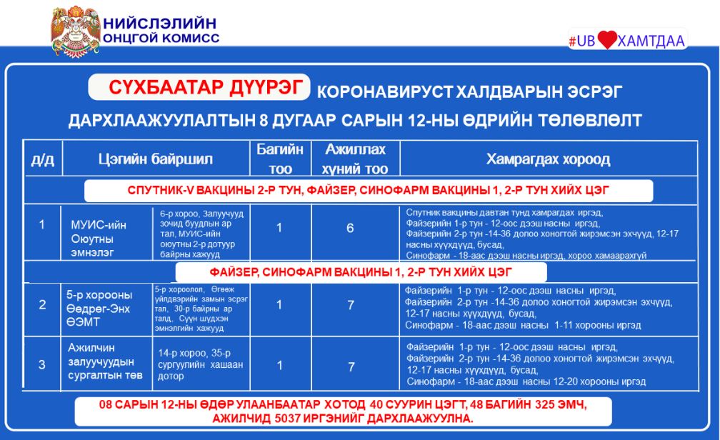 Улаанбаатар хотод өнөөдөр 40 цэгт 48 багийн 325 эмч, ажилтан ажиллаж, 5037 иргэнийг дархлаажуулахаар төлөвлөжээ.