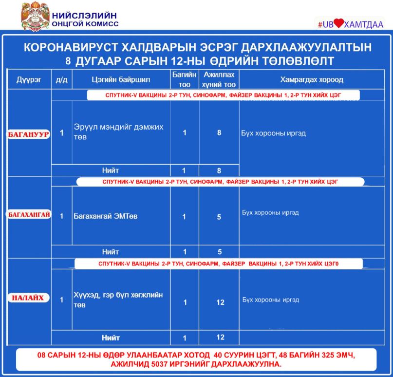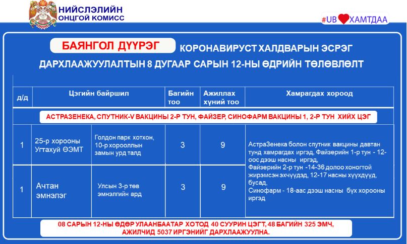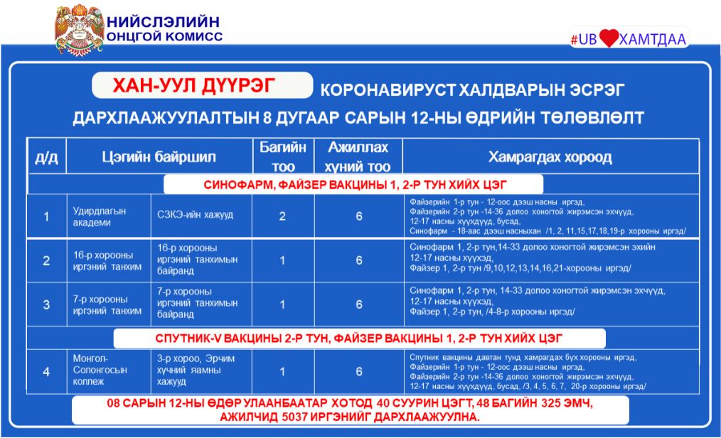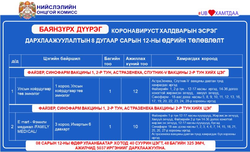 Ингээд дархлаажуулалтын цэгүүдийг дүүрэг тус бүрээр танилцуулъя.