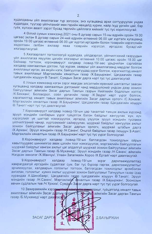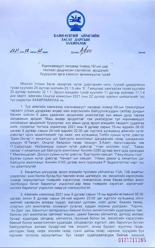 Иймд тус аймгийн Засаг даргын захирамжаар аймгийн хэмжээнд өнөөдөр 06:00 цагаас эхлэн энэ сарын 23-ний 23:00 цаг хүртэл хугацаанд олон нийтийг хамарсан үйл ажиллагааг түр зогсоож, нийслэл болон бусад аймгаас ирэх хөдөлгөөнийг хаахаар шийдвэрлэсэн гэж Баян-Өлгий аймгийн Онцгой байдлын газраас мэдээллээ.