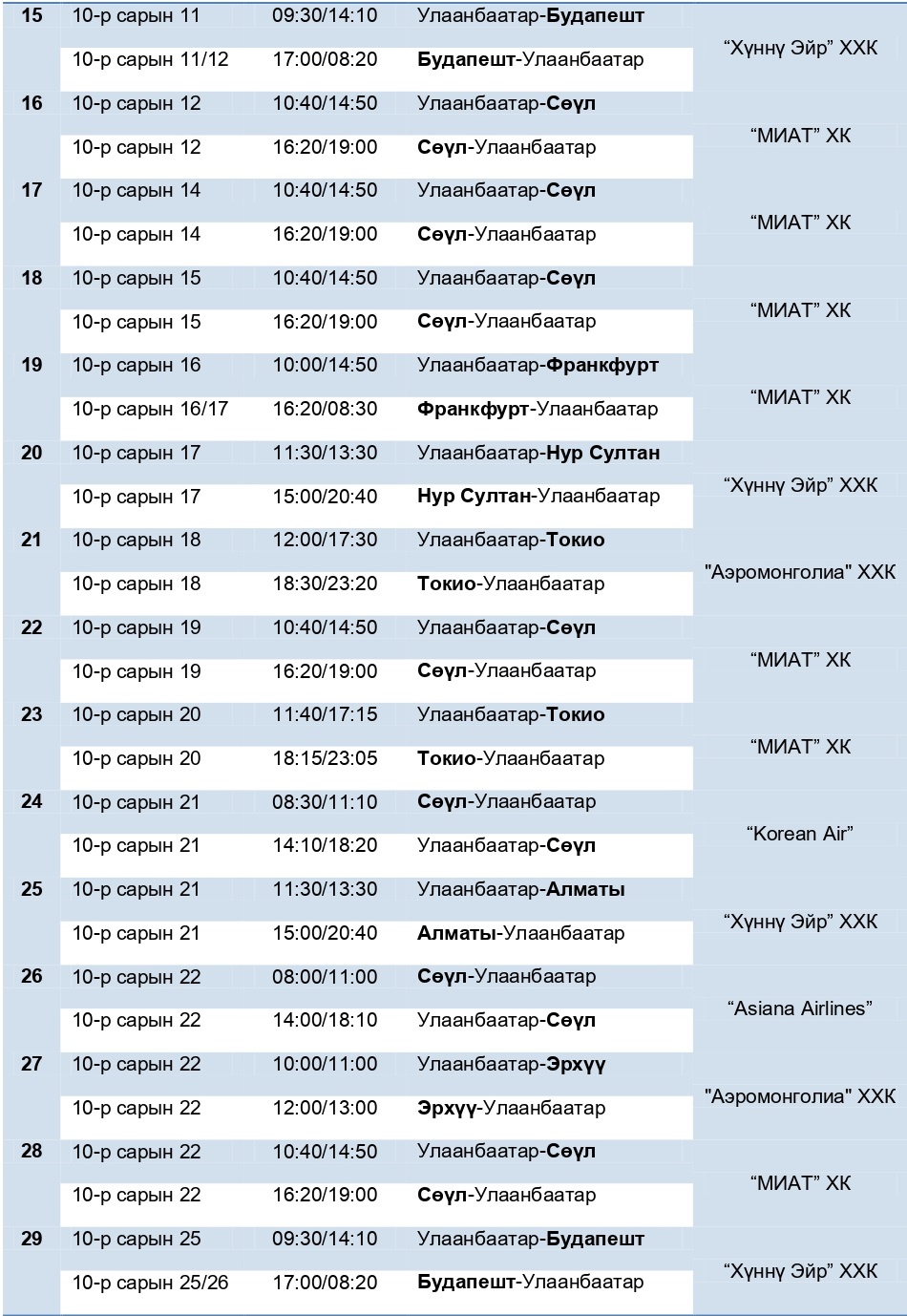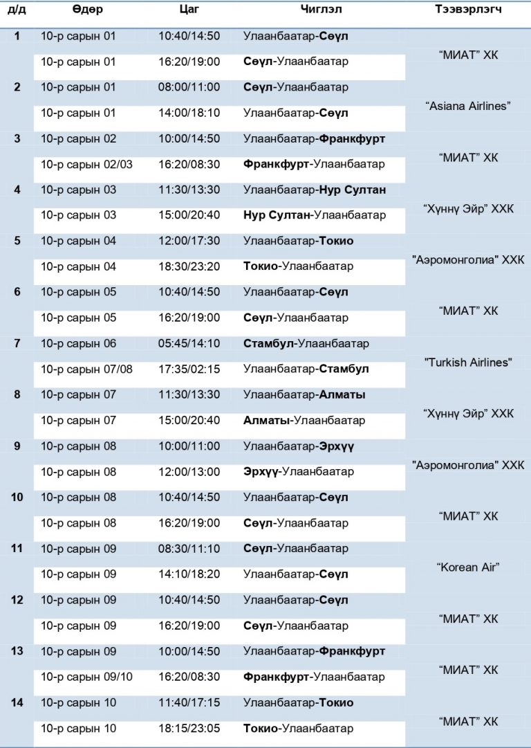 Иргэний нисэхийн ерөнхий газраас ирэх аравдугаар сард хийх олон улсын нислэгийн хуваарийг баталжээ. Уг хуваарийн дагуу аравдугаар сард нийт 37 удаагийн нислэг үйлдэхээр төлөвлөсөн байна. Мөн цар тахлын үед авч хэрэгжүүлж буй халдвар хамгааллын үйл ажиллагаанаас шалтгаалан зарим нислэгийн цаг өөрчлөгдөж болзошгүйг анхааруулав.
