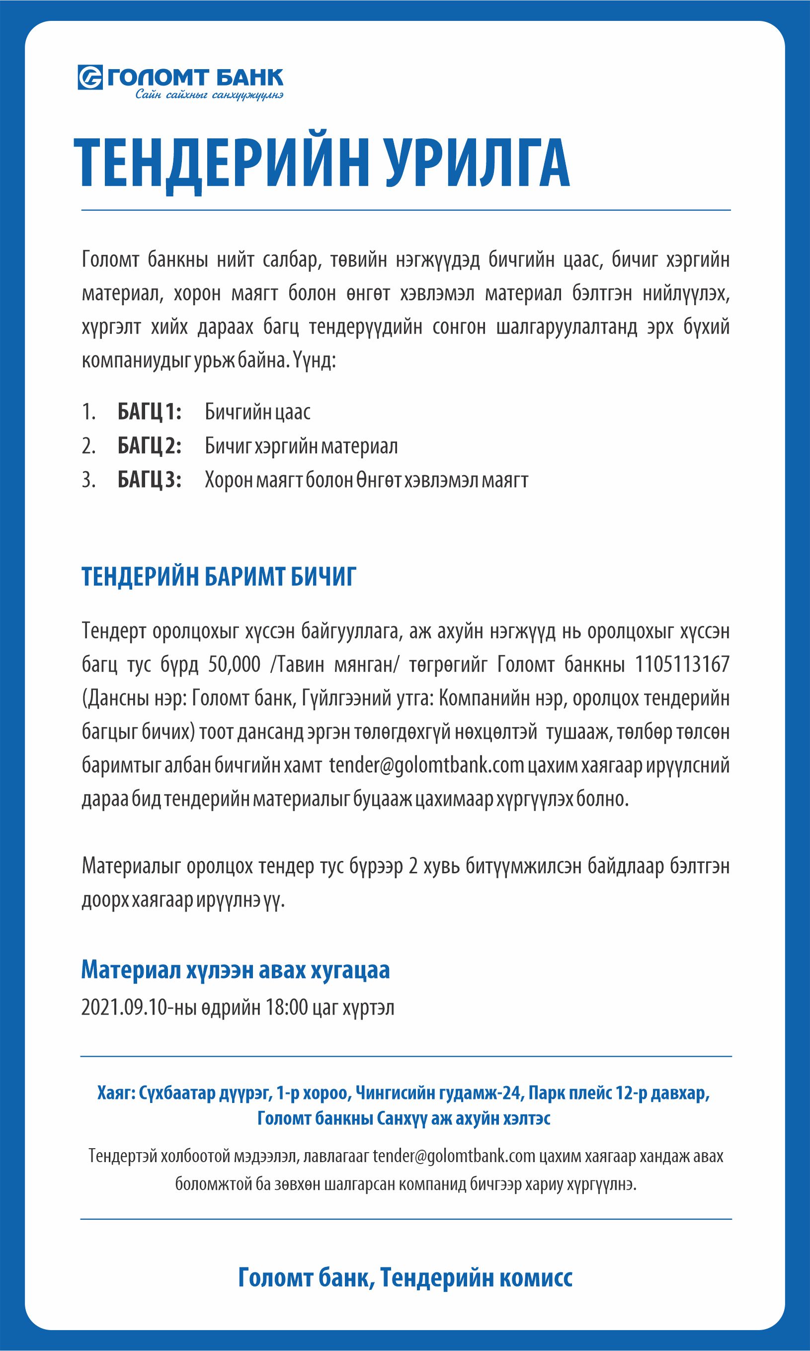 | ГОЛОМТ БАНК: ТЕНДЕРИЙН УРИЛГА |