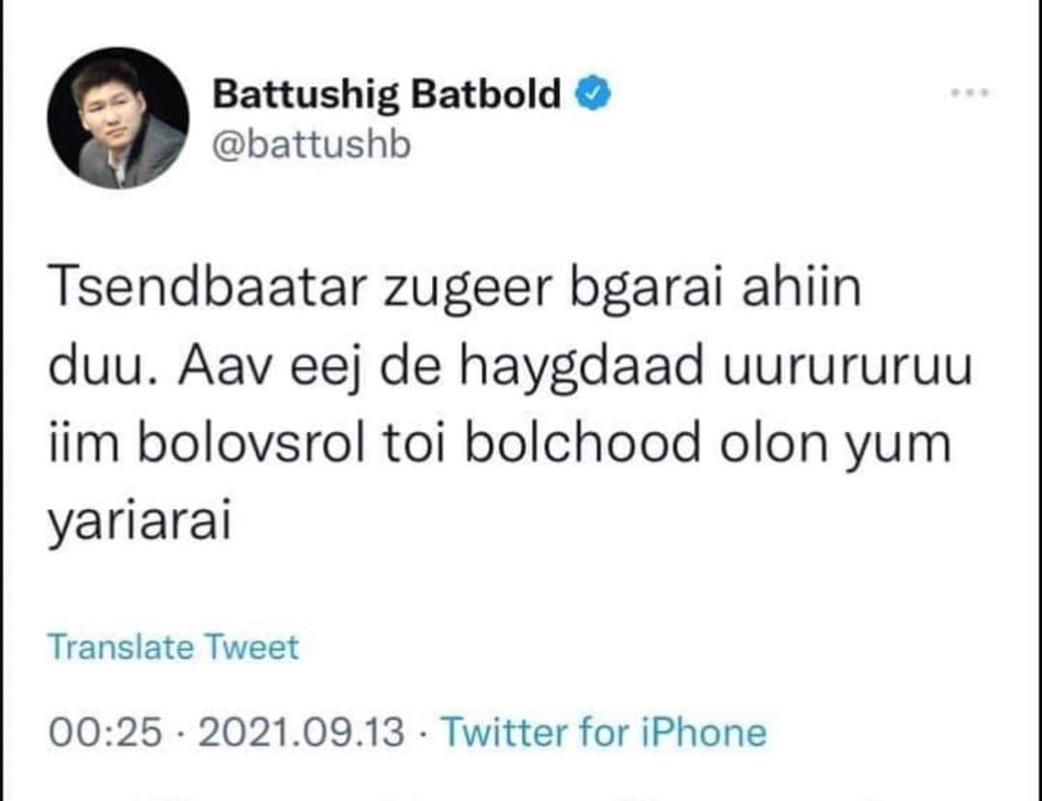 Өнгөрсөн долоо хоногт МУГТ Э.Цэндбаатарыг үндэсний шигшээ багаас хасах шийдвэр гарсан. Мөн түүний бусдад зодуулж, ухаангүй болсон бичлэг олон нийтэд ил болж, иргэдийг талцуулсан. Тэгвэл Э.Цэндбаатарыг цахим хуудсаараа хэд хэдэн мэдэгдэл хийсний дараа МҮОХ-ны дэд Ерөнхийлөгч багийн ахлагч Б.Баттүшиг твиттер хуудастаа “Цэндбаатар зүгээр байгаарай ахын дүү. Аав ээждээ хаягдаад өөрөөрөө ийм боловсролтой болчихоод олон юм яриарай” хэмээн өчигдөр орой жиргэсэн байв. Тэрбээр тун удалгүй жиргээгээ устгажээ.