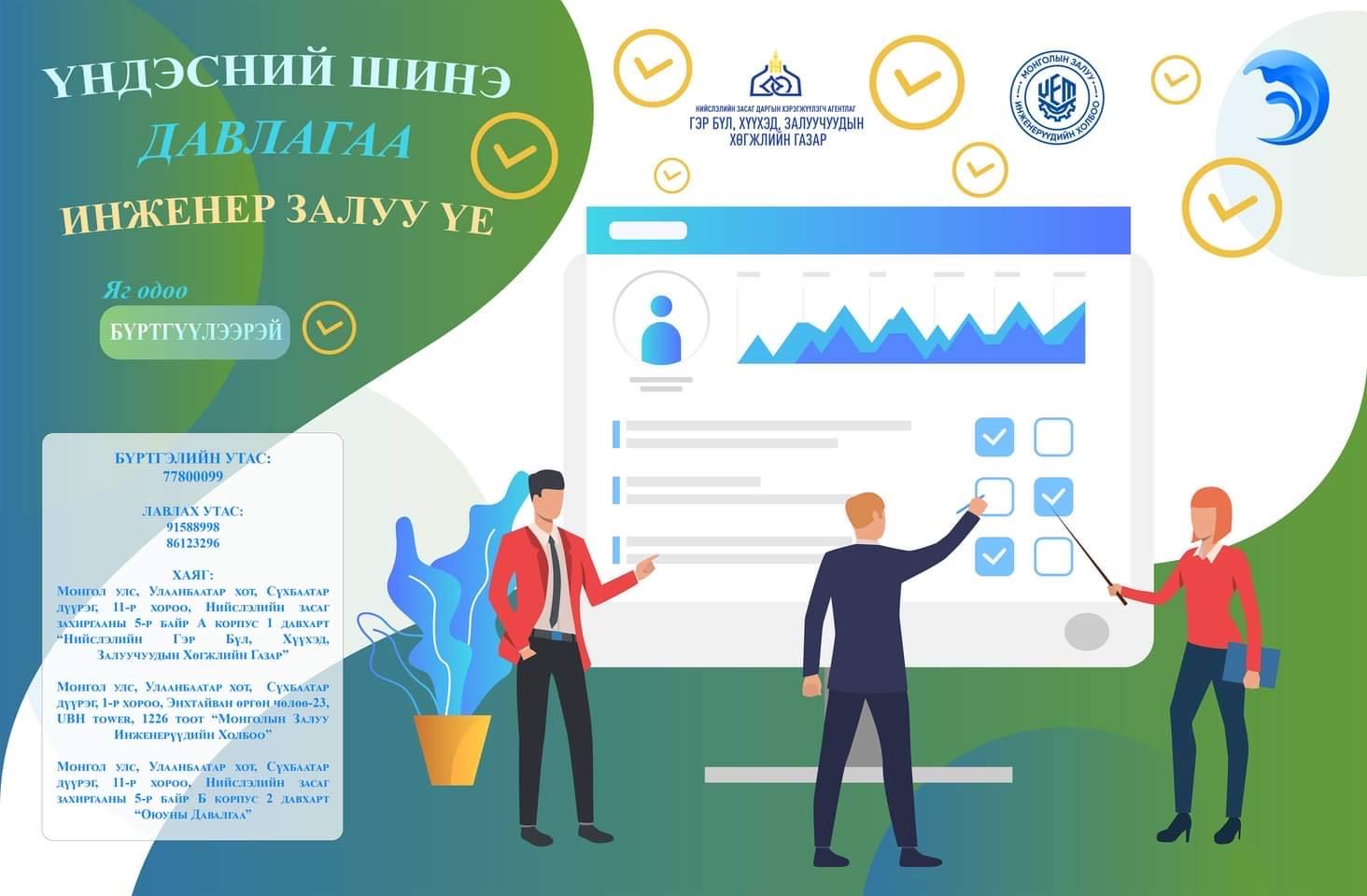 Нийслэлийн Засаг даргын хэрэгжүүлэгч агентлаг Гэр бүл, хүүхэд, залуучуудын хөгжлийн газар “Монголын залуу инженерүүдийн холбоо” ТББ, “Цахим оюуны эерэг давлагаа” ТББ-ууд хамтран “Үндэсний шинэ давлагаа-Инженер залуу үе” хөтөлбөрийг хэрэгжүүлэхээр хамтын ажиллагааны Санамж бичгийг байгууллаа.