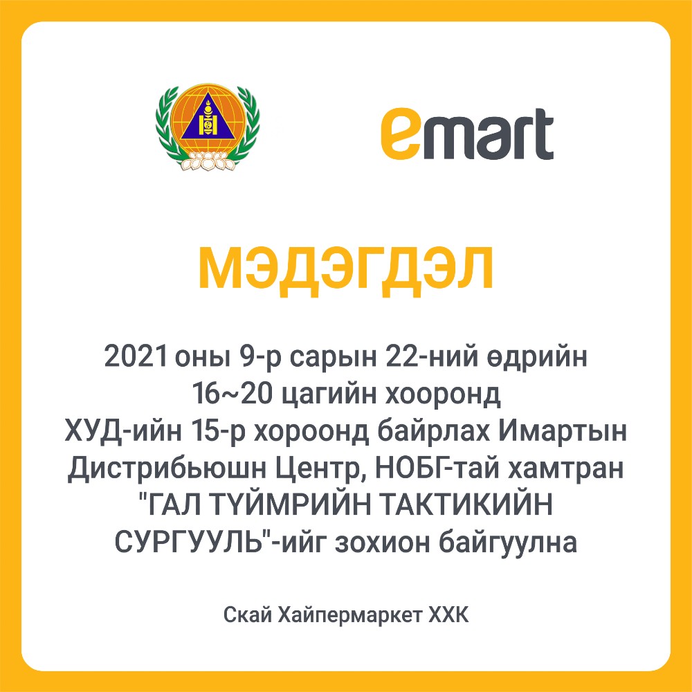 Харин энэ удаад Хан-Уул дүүргийн 15 дугаар хороонд байрлах И-мартийн дистрибьюшн центрийн ажилчдын хамарсан, НОБГ-ын баг бүрэлдэхүүнтэй хамтран гамшиг, гал түймрийн аюулын үед аврах ажиллагаа явуулах, бэлэн байдлын дадлага сургууль олгох сургуулилтыг 2021 оны есдүгээр сарын 22-ны өдөр зохион байгуулна.