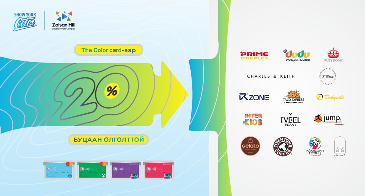 Энэхүү урамшууллын хүрээнд Зайсан Хилл цогцолборт байрлах 15 байгууллагаар үйлчлүүлэхдээ The Color картаа ашиглан төлбөр, тооцоогоо хийсэн тохиолдолд үнийн дүнгийн 20%-ийг буцаан олгох юм. Нэг картаар хэдэн ч удаа үйлчилгээ авах боломжтой ба буцаан олголт худалдан авалт хийснээс 1 өдрийн дараа таны дансанд орно.