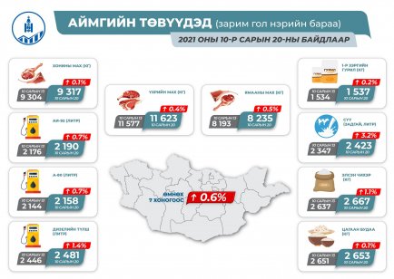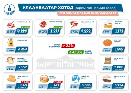 Нийслэл болон орон нутагт зарагдаж буй өргөн хэрэглээний бараа, автобензиний үнийн судалгааг Үндэсний сатистикийн хорооноос гаргажээ. Ингэхдээ энэ оны аравдугаар сарын 20-ны байдлаар Улаанбаатар хотын гол нэрийн барааны үнэ өмнөх сараас 2.1 хувиар өсөж, өмнөх долоо хоногоос 0.3 хувиар буурсан байна. Харин орон нутагт гол нэрийн барааны үнэ өнгөрсөн долоо хоногоос 0.6 хувиар өсжээ.