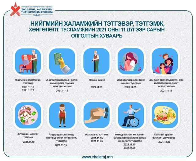 Энэ сард олгох нийгмийн халамжийн тэтгэвэр, тэтгэмж, хөнгөлөлт, тусламжийн хуваарийг ХХҮЕГ-аас гаргажээ. Тухайлбал, хүүхдийн мөнгийг энэ сарын 18-аас олгох бол эхийн алдар одонгийн мөнгөн тусламж болон ахмад настан, хөгжлийн бэрхшээлтэй иргэнд олгох хөнгөлөлт тусламжийг 15-аас олгож эхлэх аж.