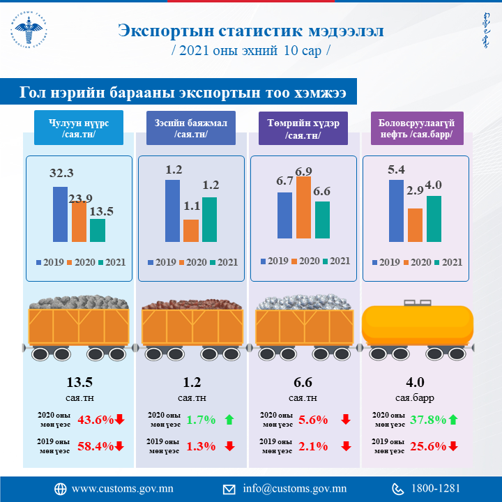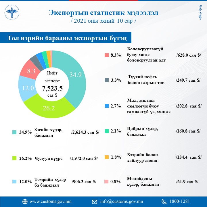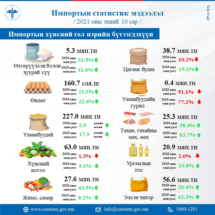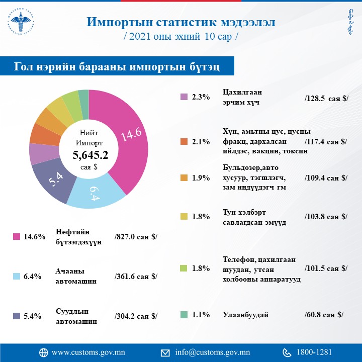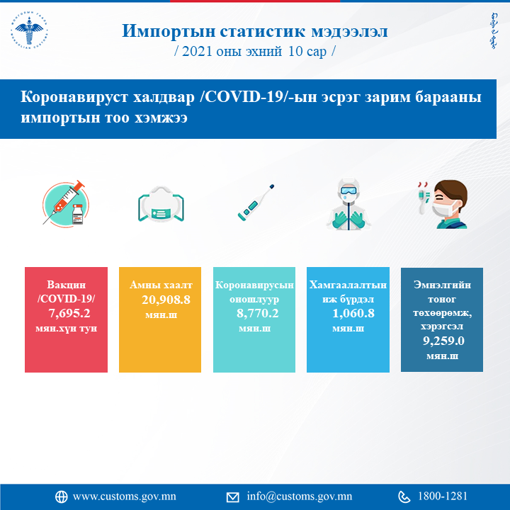 Энэ оны эхний арван сард импортын статистик мэдээллээр 7.695.2 мянган тун вакцин, 20.908.8 мянган ширхэг амны хаалт, 8.770.2 мянган ширхэг коронавирусийн оношлуур, 1.060.8 мянган ширхэг хамгаалалтын иж бүрдэл, 9.259.0 эмнэлгийн тоног, төхөөрөмж хэрэгсэл татан авчээ. Бусад гаалийн статистик тоон мэдээллийг хүргэж байна.